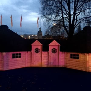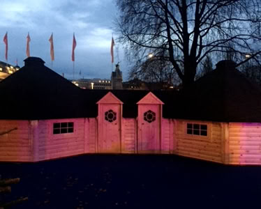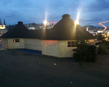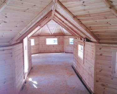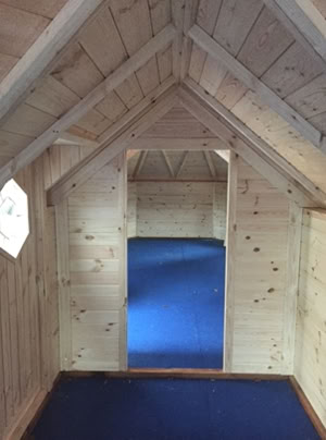 Střecha: 18 mm borové obložení zvenčí a 14 mm vnitřní borové obložení se 100 mm izolací z kamenné vlny mezi, pokryto tmavě hnědou bitumenovou krytinou membrány