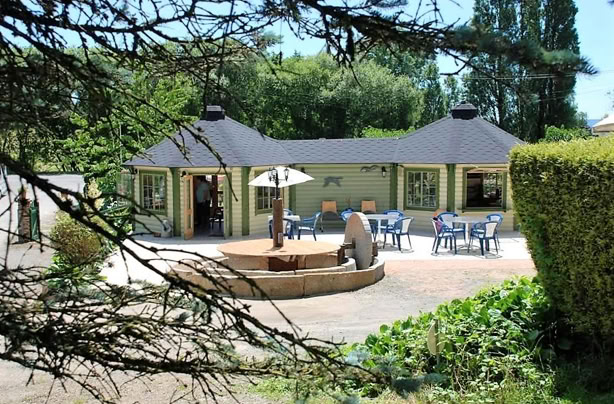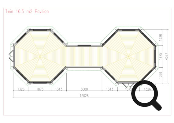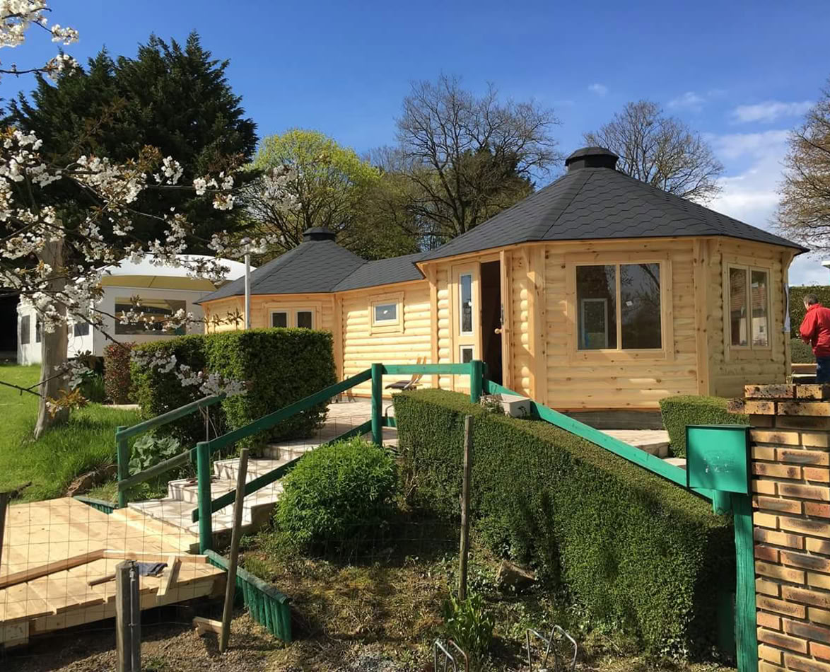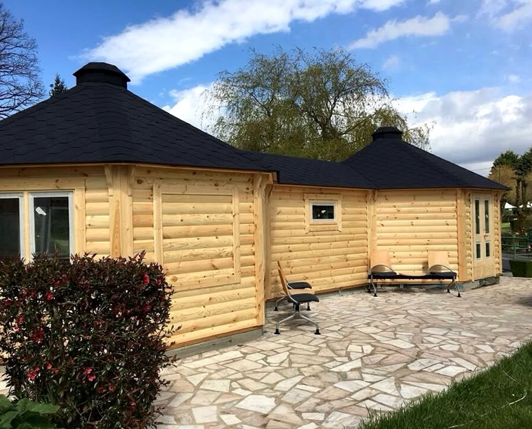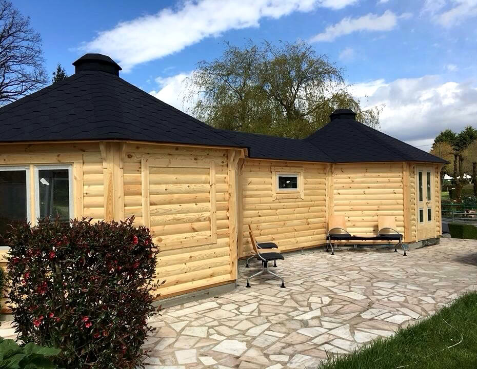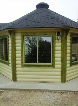 Střecha: 18 mm borové obložení zvenčí a 14 mm vnitřní borové obložení se 100 mm izolací z kamenné vlny mezi, pokryto tmavě hnědou bitumenovou krytinou membrány