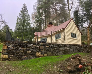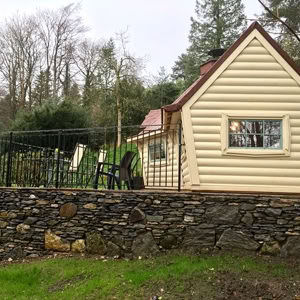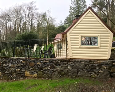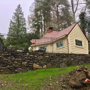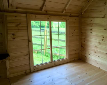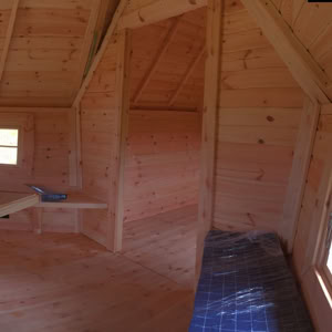 Střecha: 18 mm borové obložení zvenčí a 14 mm vnitřní borové obložení se 100 mm izolací z kamenné vlny mezi, pokryto tmavě hnědou bitumenovou krytinou membrány