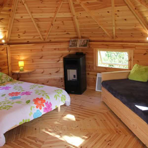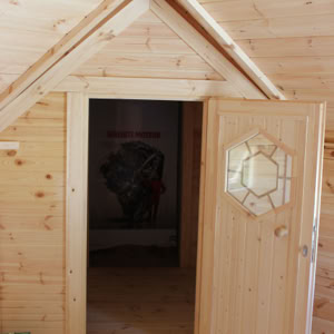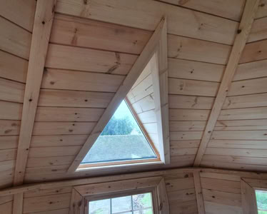 Střecha: 18 mm borové obložení zvenčí a 14 mm vnitřní borové obložení se 100 mm izolací z kamenné vlny mezi, pokryto tmavě hnědou bitumenovou krytinou membrány