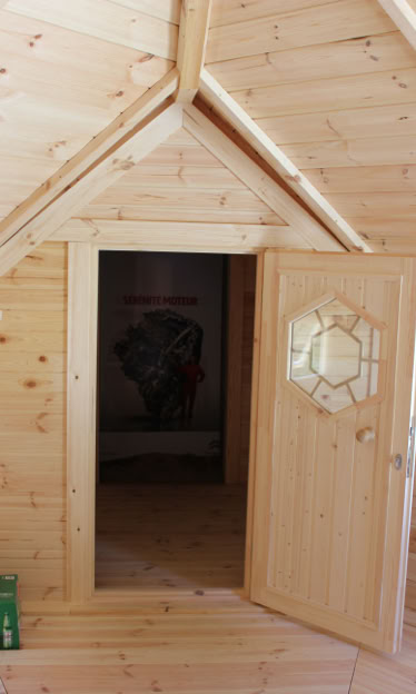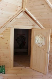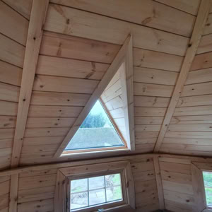 Střecha: 18 mm borové obložení zvenčí a 14 mm vnitřní borové obložení se 100 mm izolací z kamenné vlny mezi, pokryto tmavě hnědou bitumenovou krytinou membrány