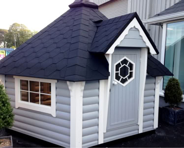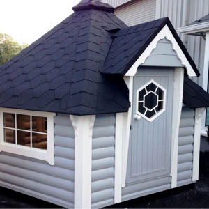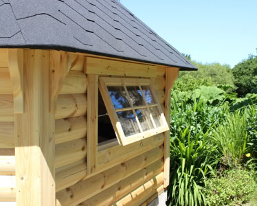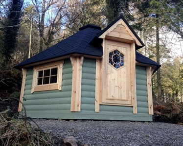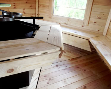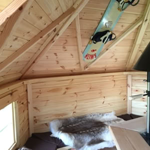 Střecha: 18 mm borové obložení zvenčí a 14 mm vnitřní borové obložení se 100 mm izolací z kamenné vlny mezi, pokryto tmavě hnědou bitumenovou krytinou membrány