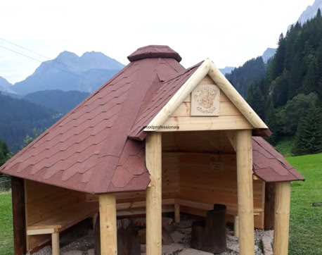 Pro zastřešení grilovacích kabin jsou použity bitumenové šindele Icopal SBS modifikované finským výrobcem a vyztužené skelným vláknem 120 g/m². Modifikace SBS dodává membránám šindele pružnost, aplikační pevnost a odolnost.
