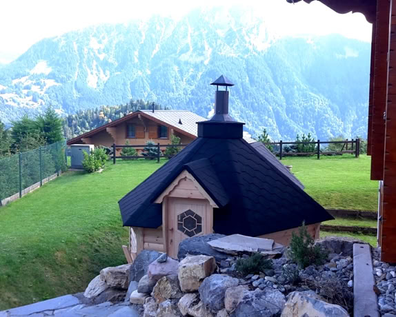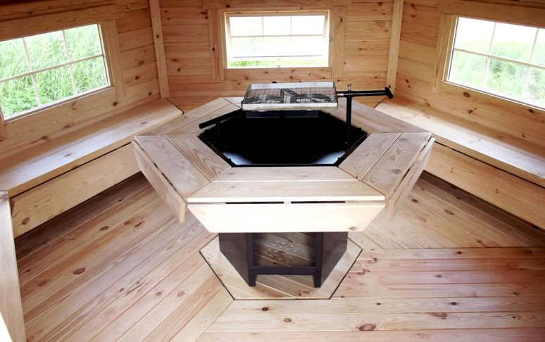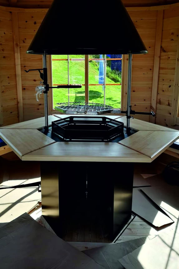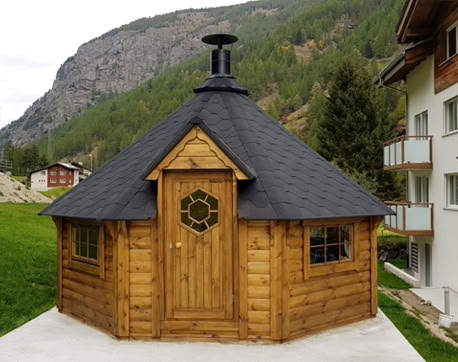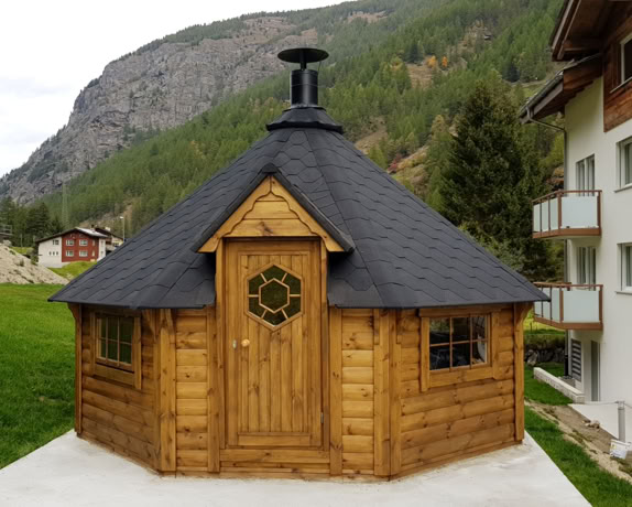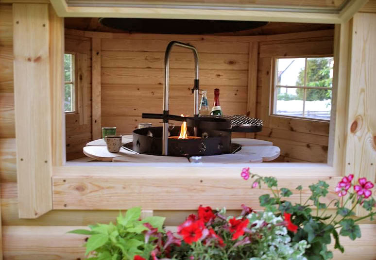 Naši specialisté navrhli a zkonstruovali exkluzivní grilovací kabiny, aby splnili i ta nejnáročnější očekávání, a to s použitím pouze nejkvalitnějšího borového dřeva a technik. Tento model se vyrábí se šikmými stěnami o tloušťce 45 mm, silnějšími podlahovými panely 28 mm a samostatnými střešními panely o tloušťce 18 mm pokrytými bitumenovými šindeli. Sada dále obsahuje dvojitá otevírací a pevná okna, dvířka z borového dřeva, luxusní gril s dřevěným stolem kolem něj, výsuvný komín, dřevěné lavice a podsedáky.