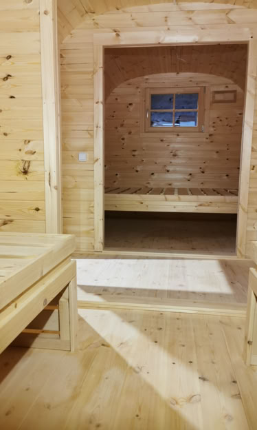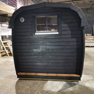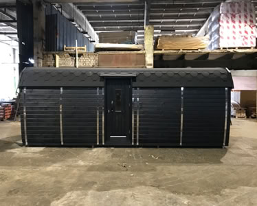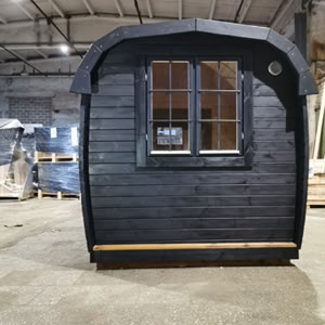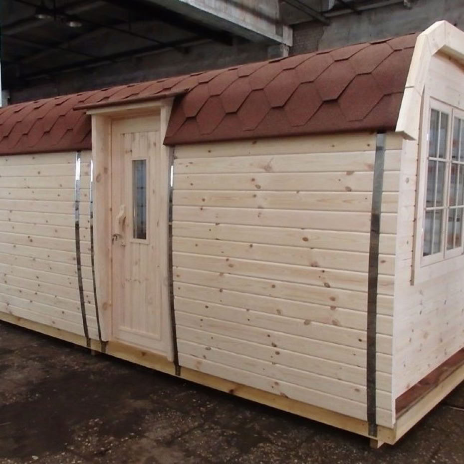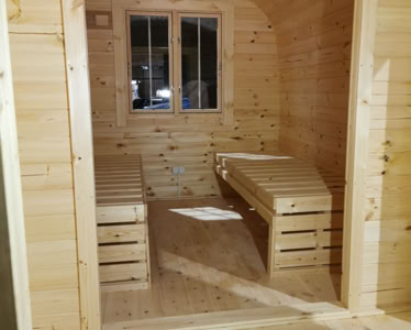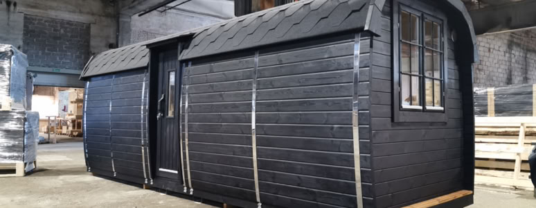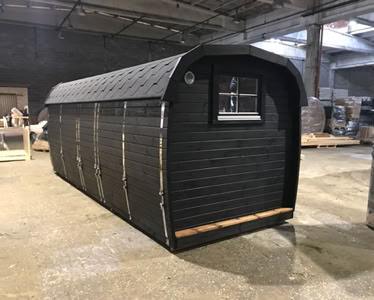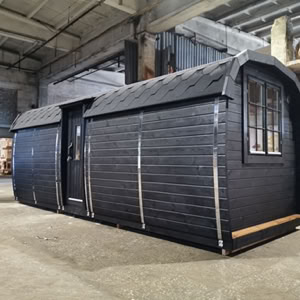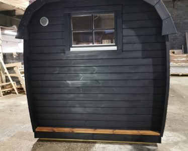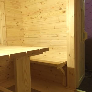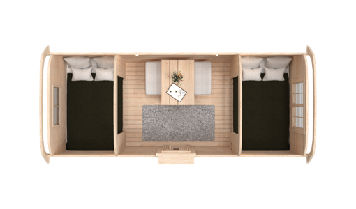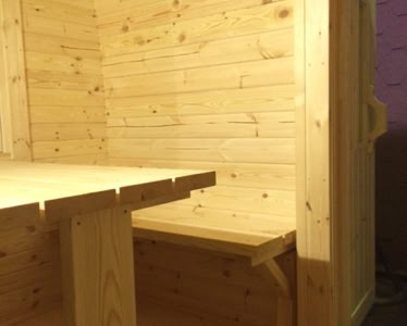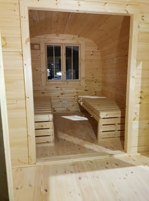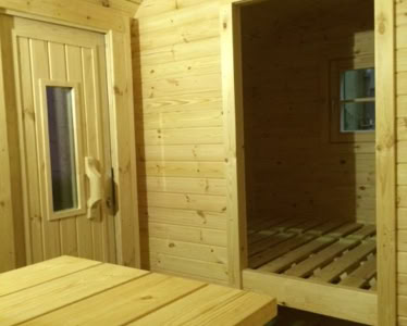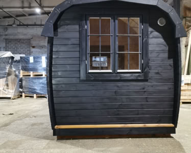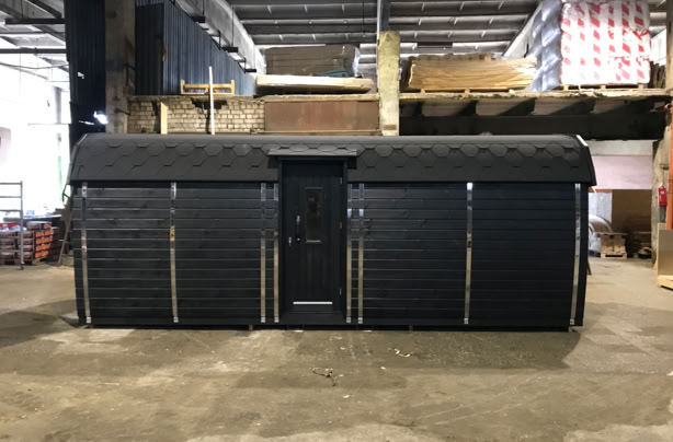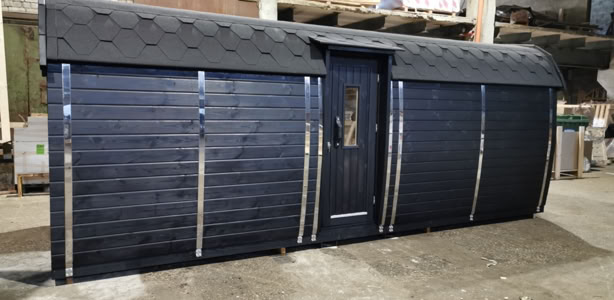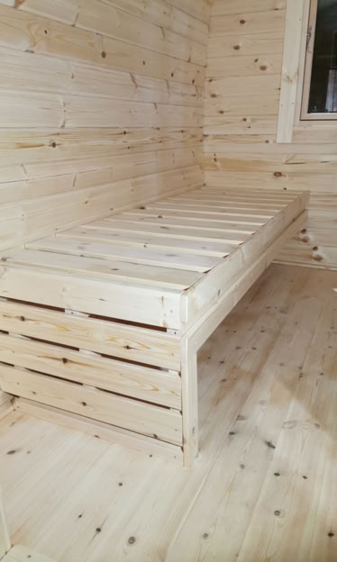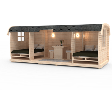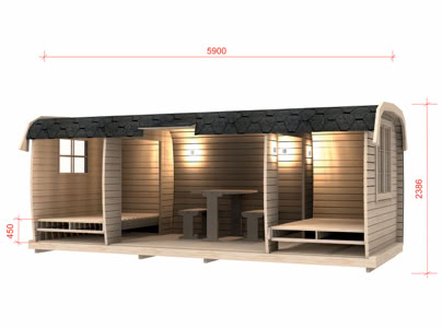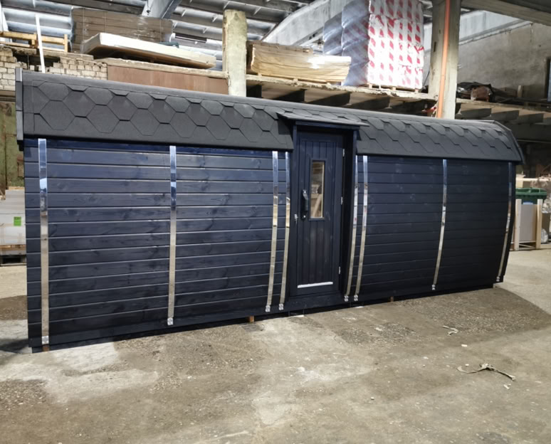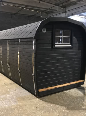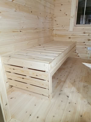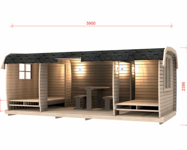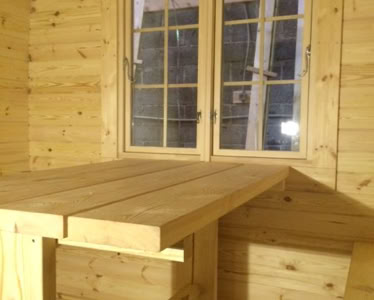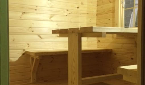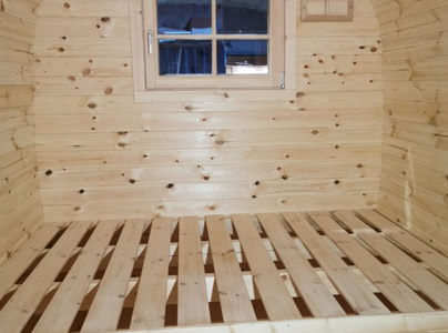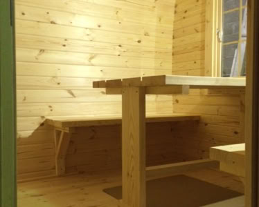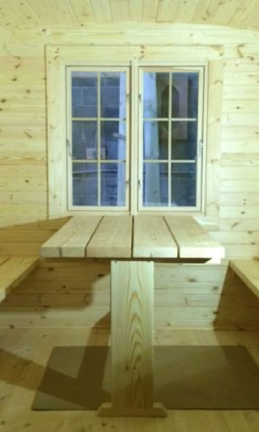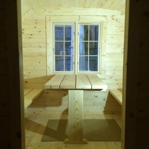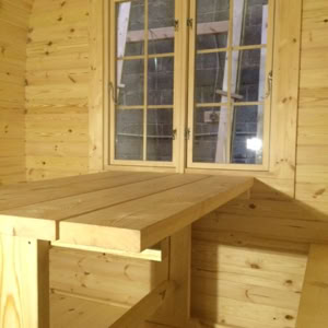 Střecha: 18 mm borové obložení zvenčí a 14 mm vnitřní borové obložení se 100 mm izolací z kamenné vlny mezi, pokryto tmavě hnědou bitumenovou krytinou membrány