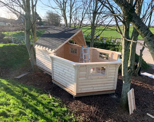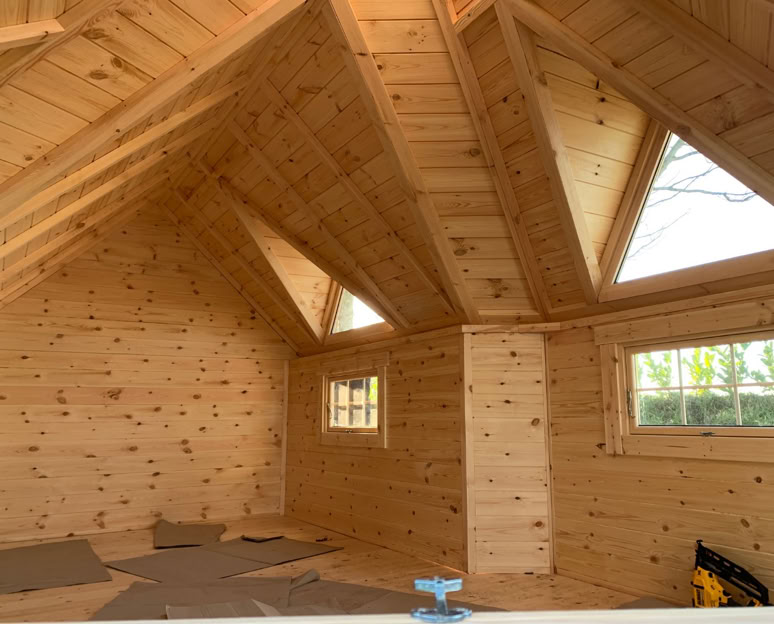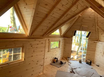 Střecha: 18 mm borové obložení zvenčí a 14 mm vnitřní borové obložení se 100 mm izolací z kamenné vlny mezi, pokryto tmavě hnědou bitumenovou krytinou membrány