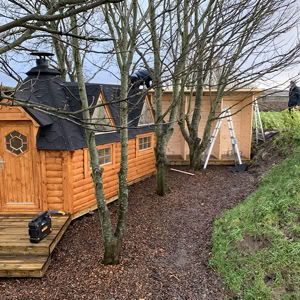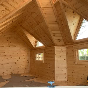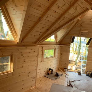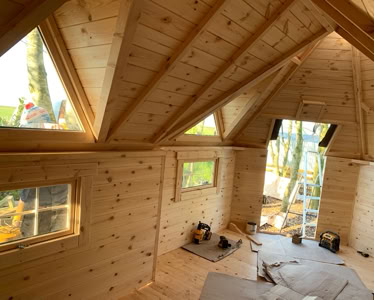 Střecha: 18 mm borové obložení zvenčí a 14 mm vnitřní borové obložení se 100 mm izolací z kamenné vlny mezi, pokryto tmavě hnědou bitumenovou krytinou membrány