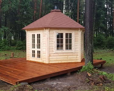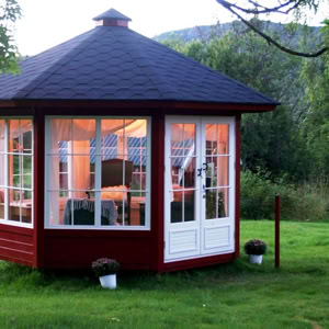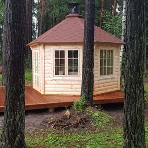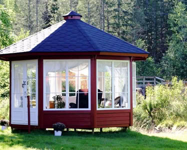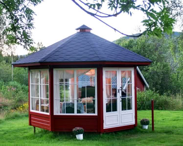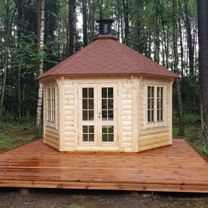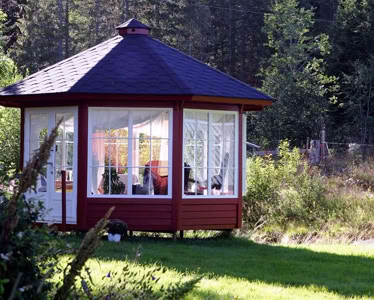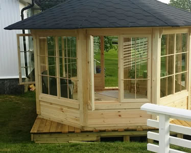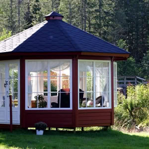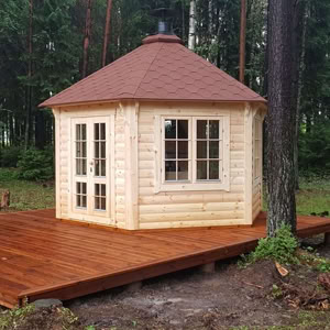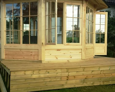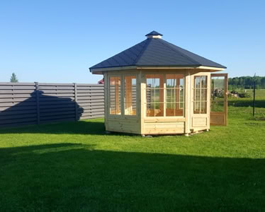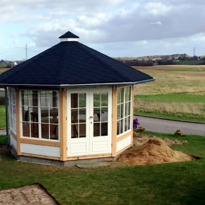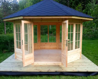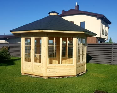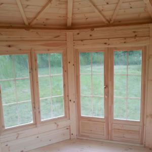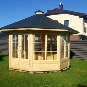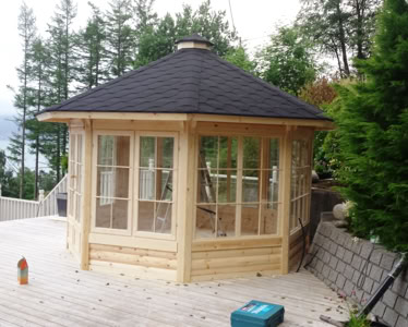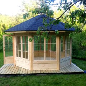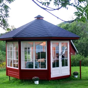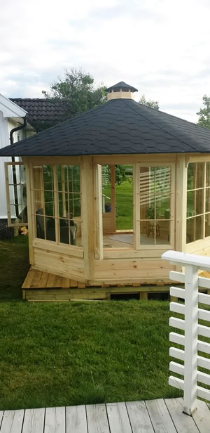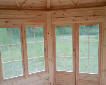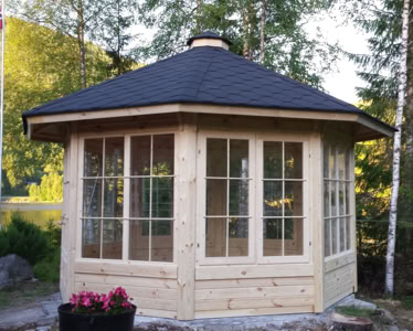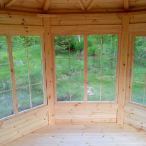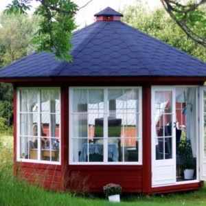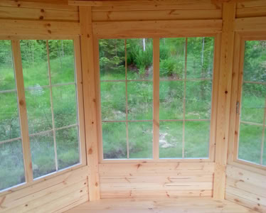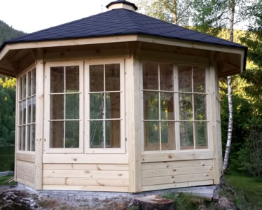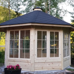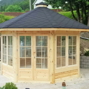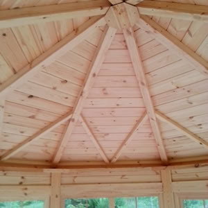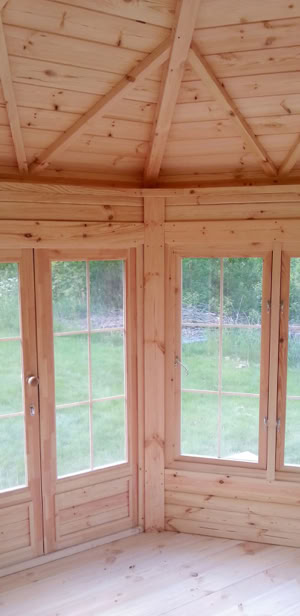 Střecha: 18 mm borové obložení zvenčí a 14 mm vnitřní borové obložení se 100 mm izolací z kamenné vlny mezi, pokryto tmavě hnědou bitumenovou krytinou membrány