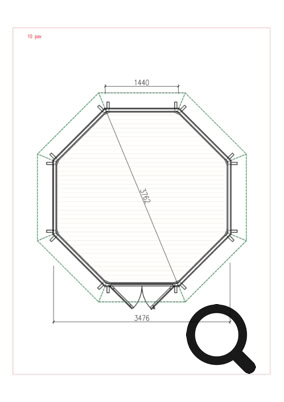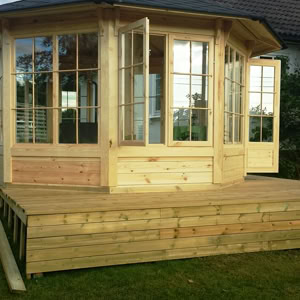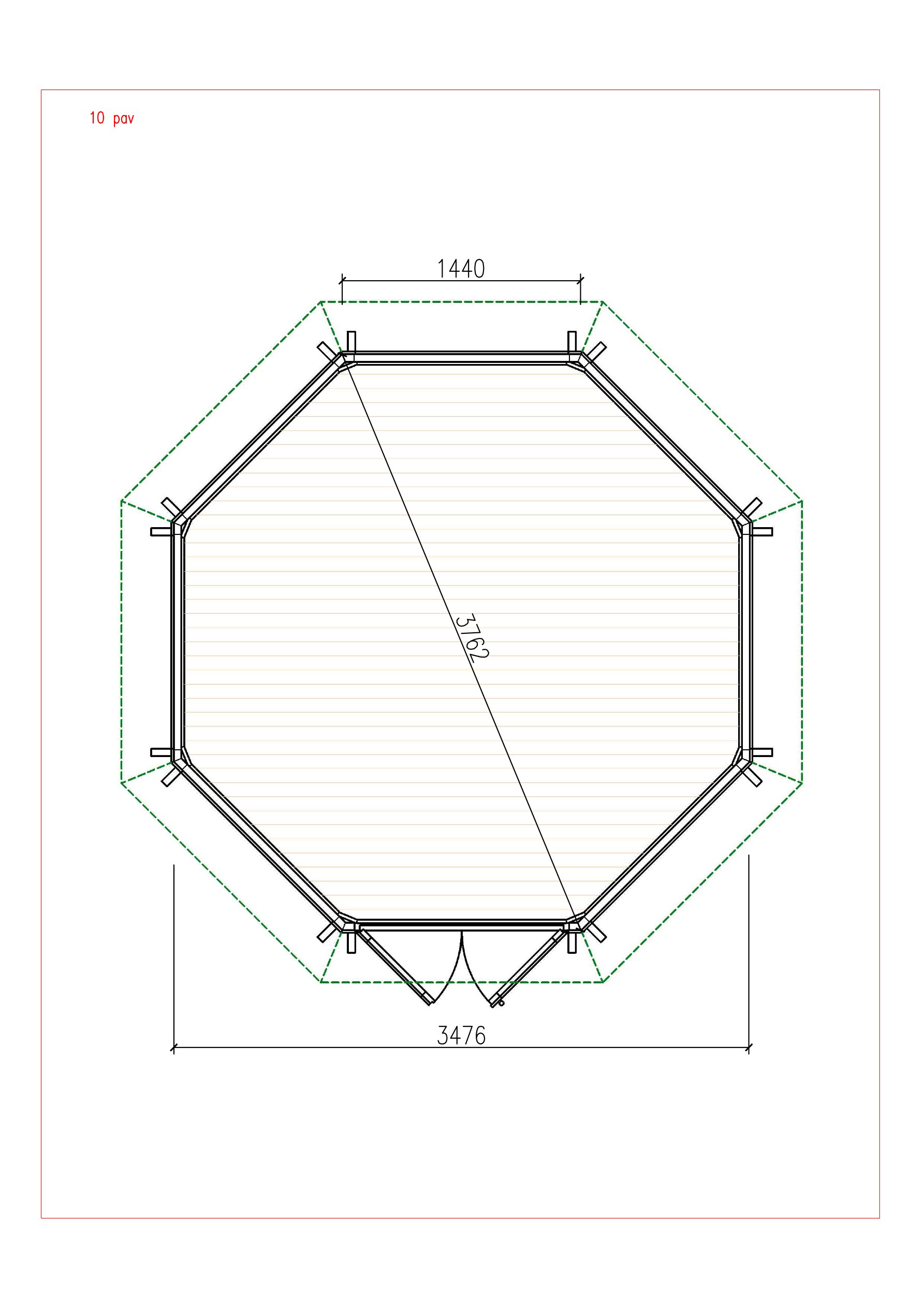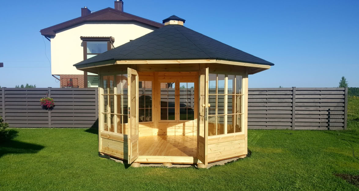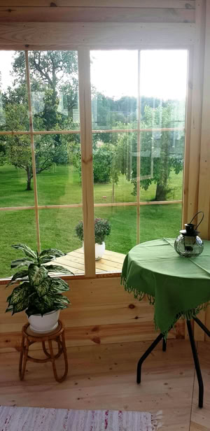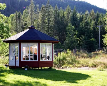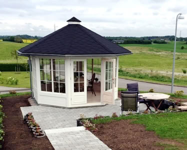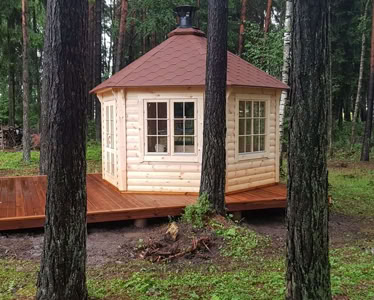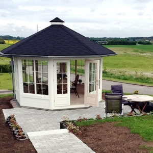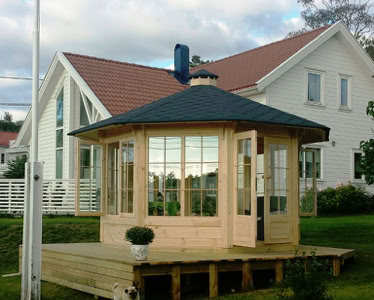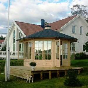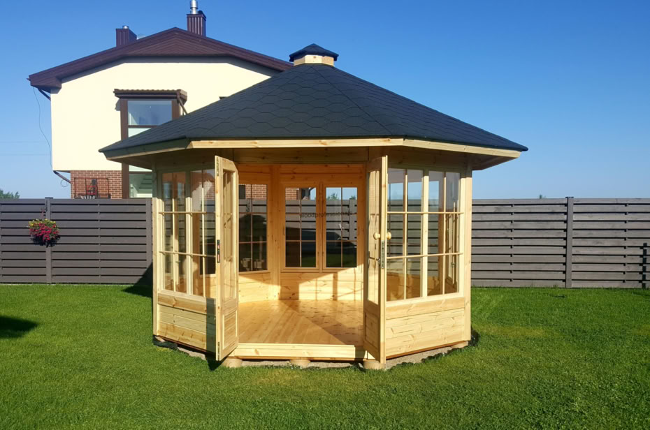 Střecha: 18 mm borové obložení zvenčí a 14 mm vnitřní borové obložení se 100 mm izolací z kamenné vlny mezi, pokryto tmavě hnědou bitumenovou krytinou membrány
