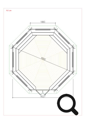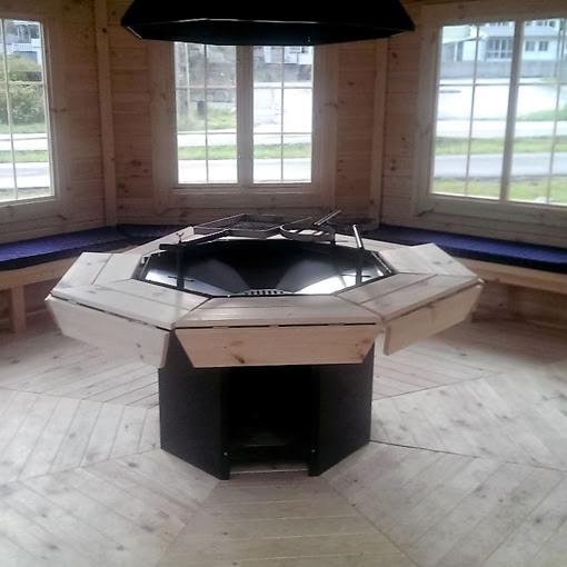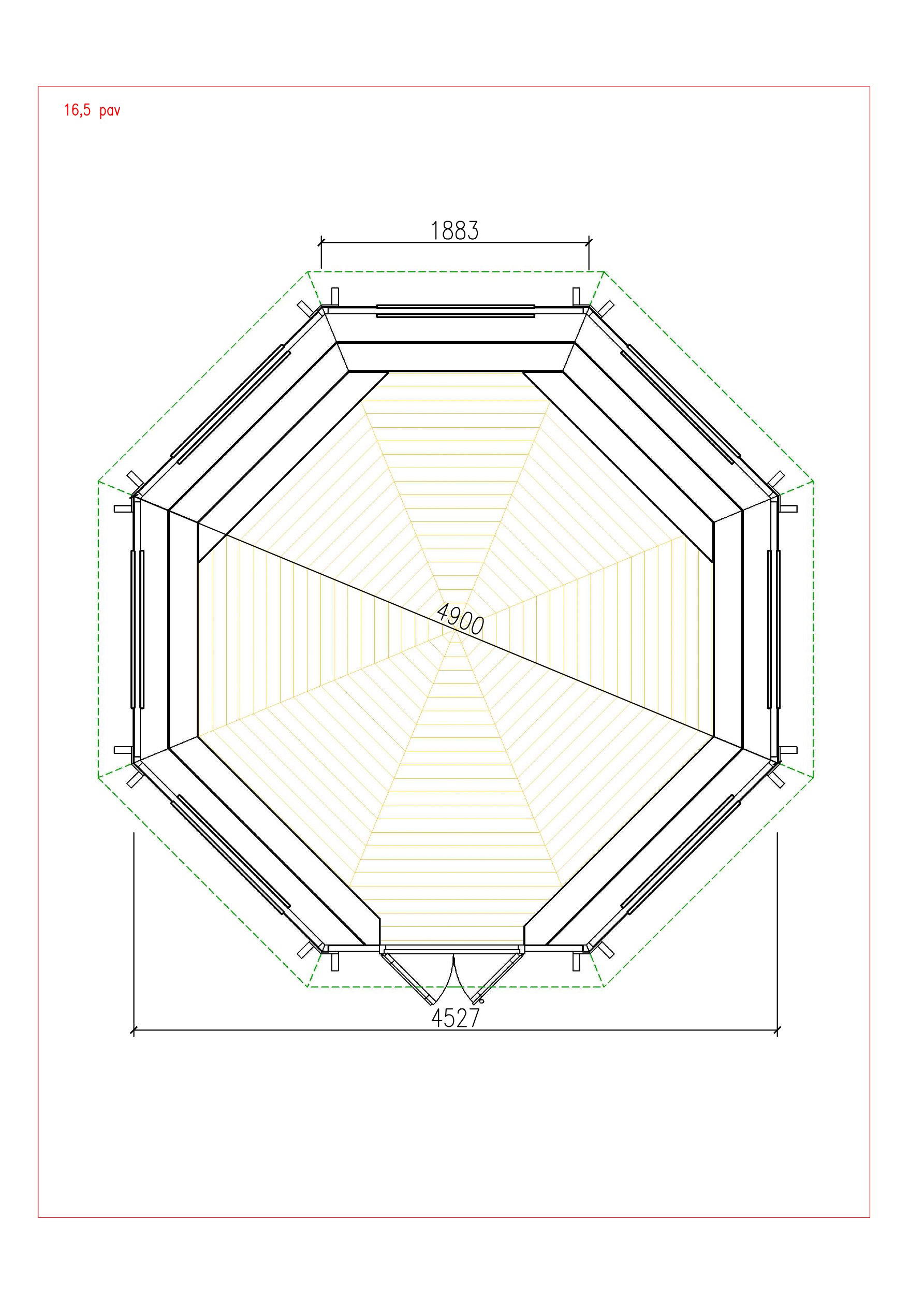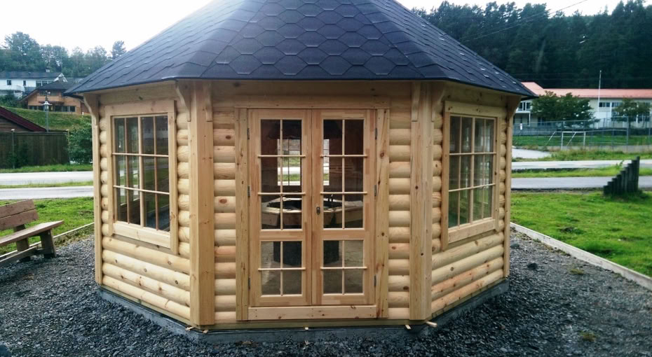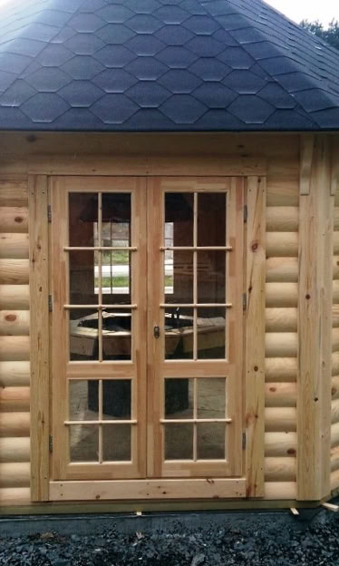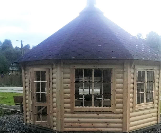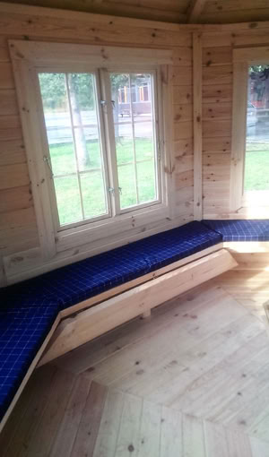Střecha: 18 mm borové obložení zvenčí a 14 mm vnitřní borové obložení se 100 mm izolací z kamenné vlny mezi, pokryto tmavě hnědou bitumenovou krytinou membrány