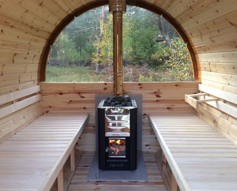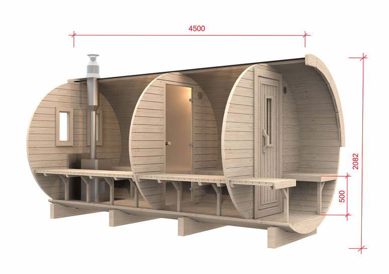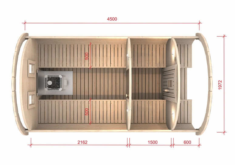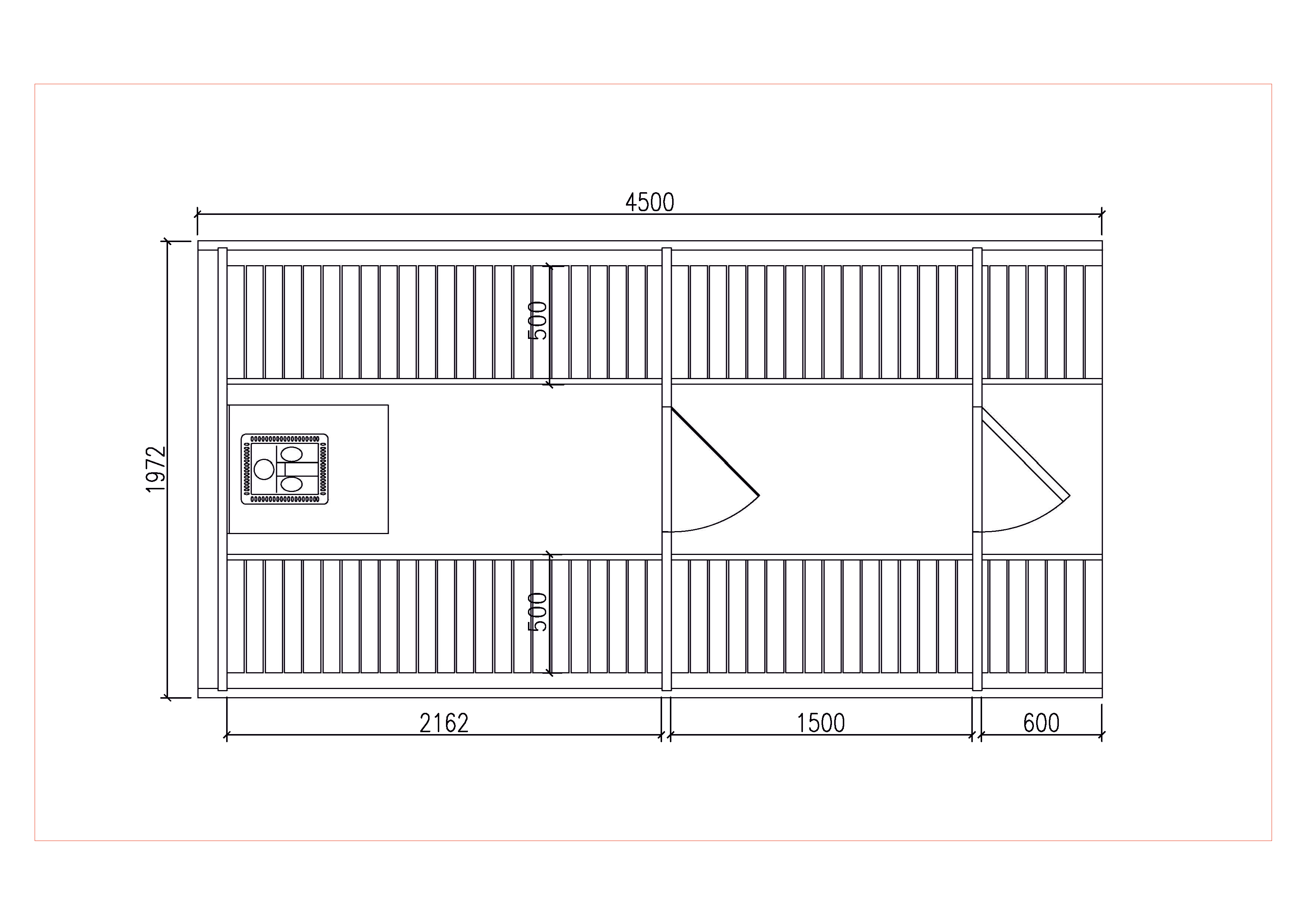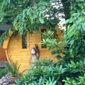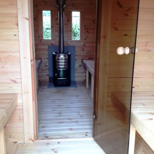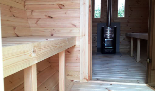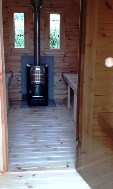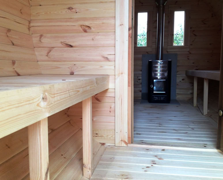 Střecha: 18 mm borové obložení zvenčí a 14 mm vnitřní borové obložení se 100 mm izolací z kamenné vlny mezi, pokryto tmavě hnědou bitumenovou krytinou membrány