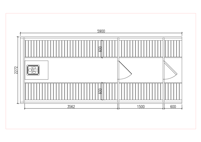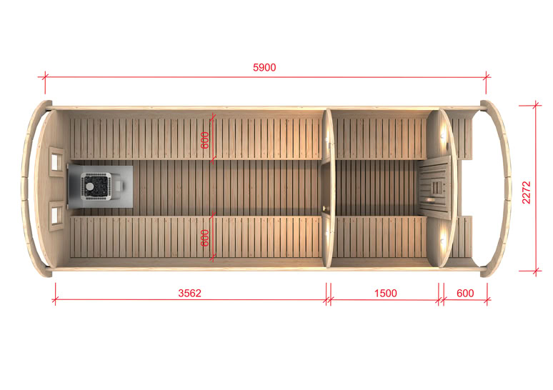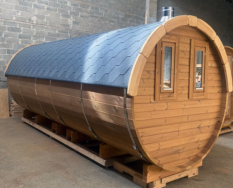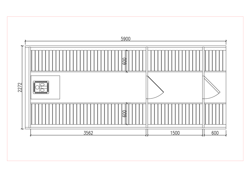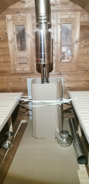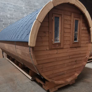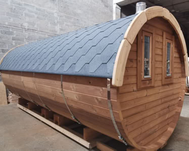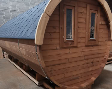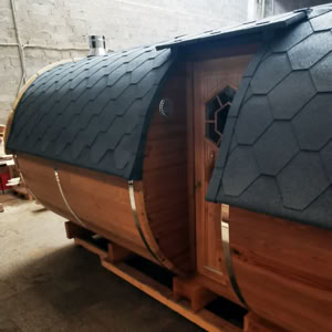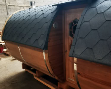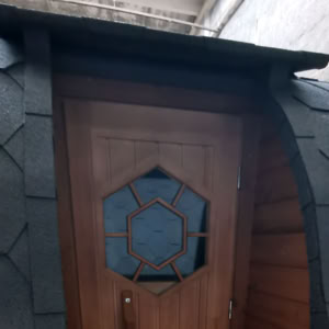 Střecha: 18 mm borové obložení zvenčí a 14 mm vnitřní borové obložení se 100 mm izolací z kamenné vlny mezi, pokryto tmavě hnědou bitumenovou krytinou membrány