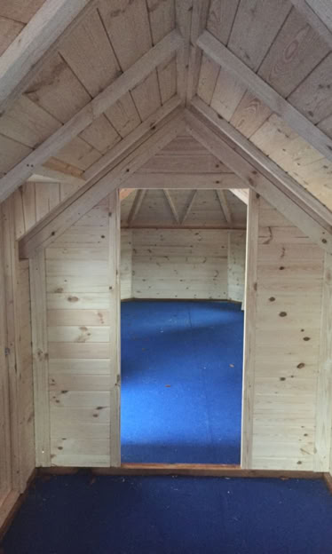 Střecha: 18 mm borové obložení zvenčí a 14 mm vnitřní borové obložení se 100 mm izolací z kamenné vlny mezi, pokryto tmavě hnědou bitumenovou krytinou membrány
