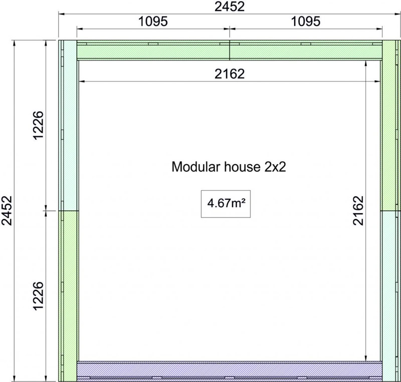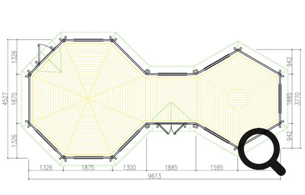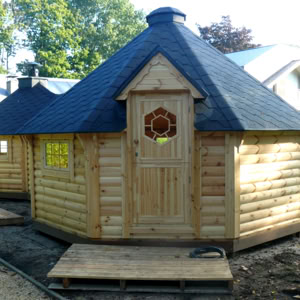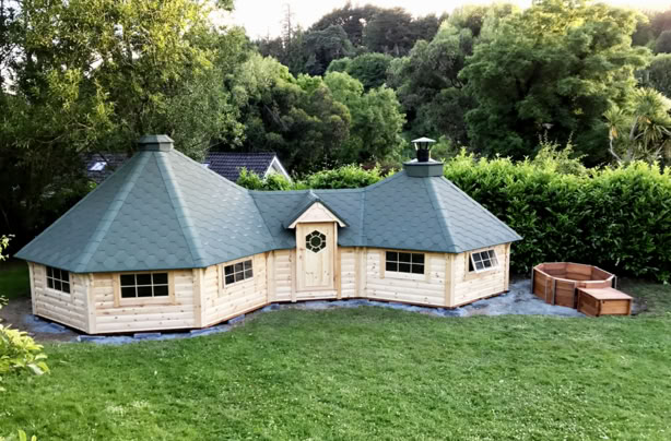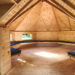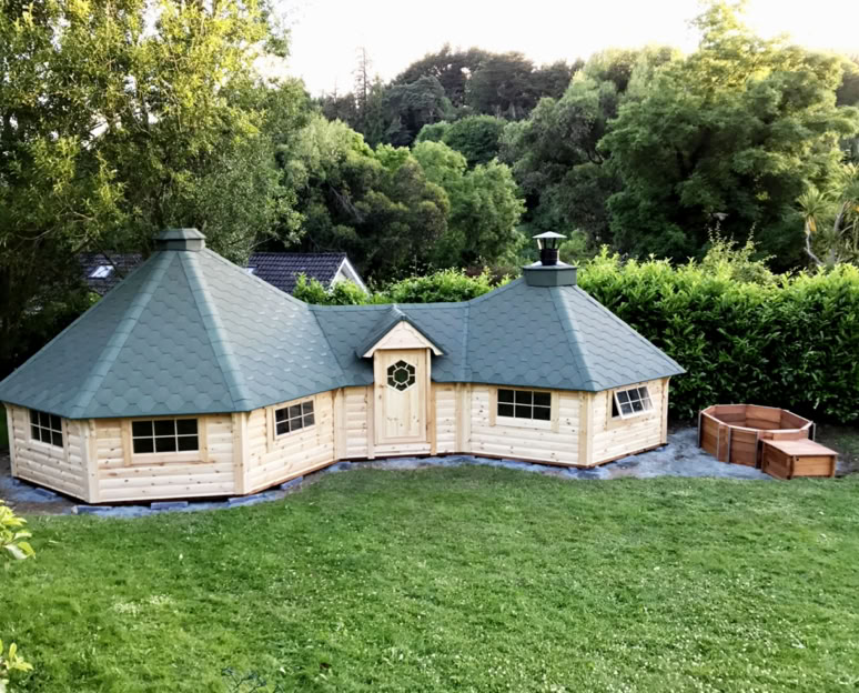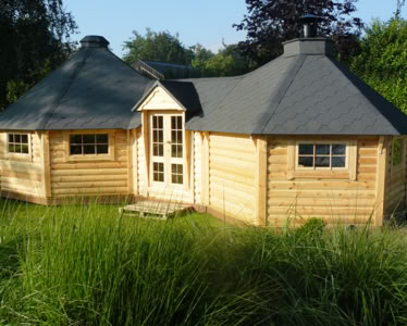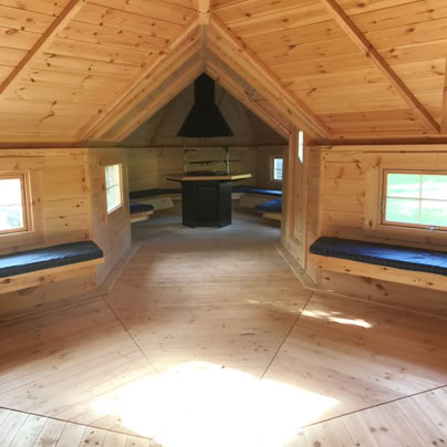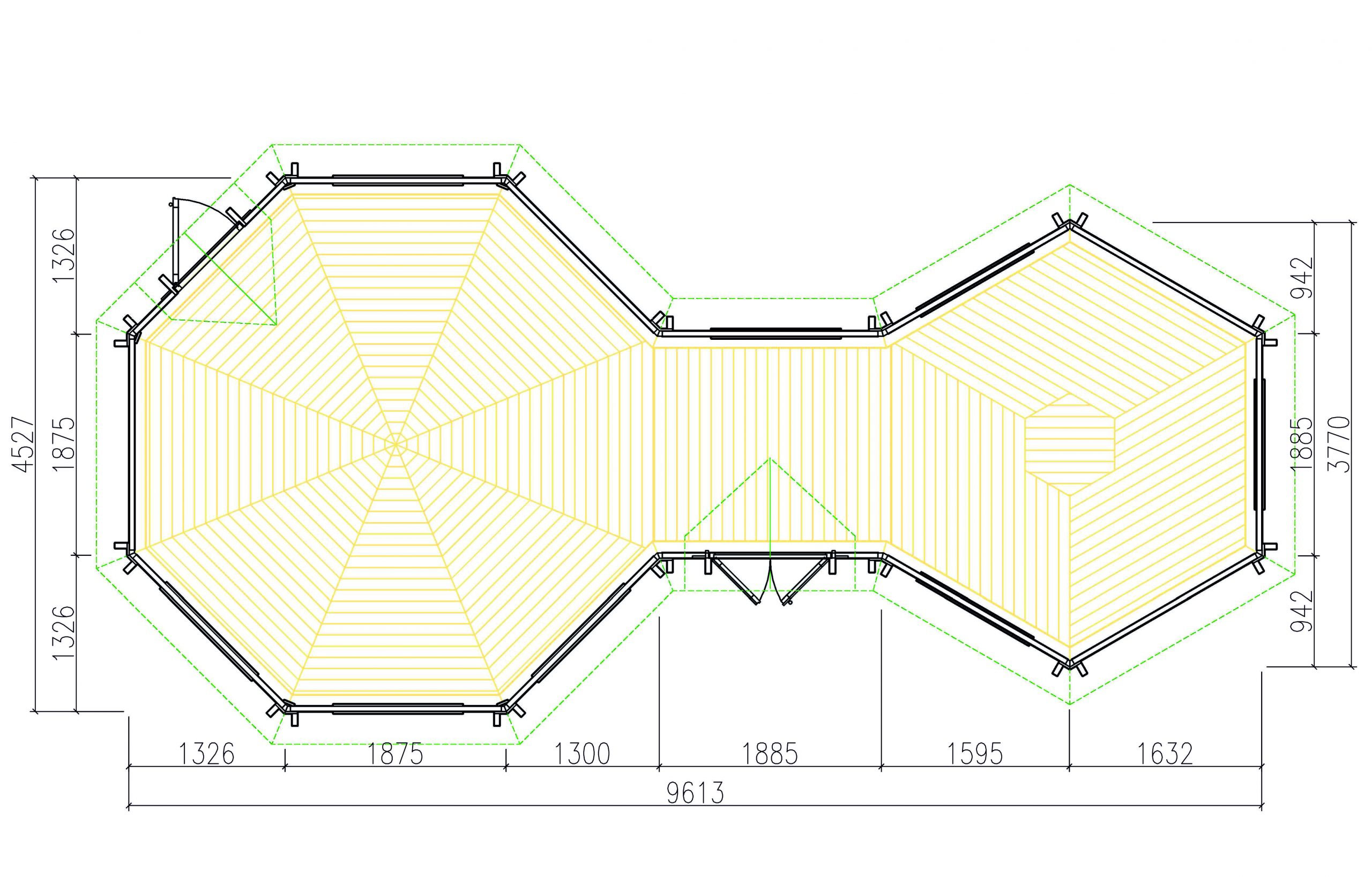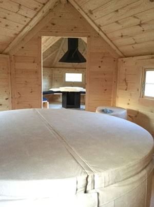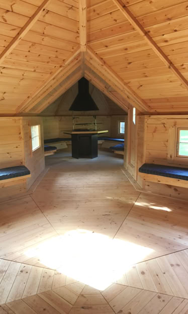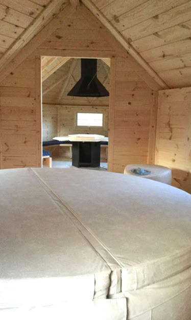 Střecha: 18 mm borové obložení zvenčí a 14 mm vnitřní borové obložení se 100 mm izolací z kamenné vlny mezi, pokryto tmavě hnědou bitumenovou krytinou membrány