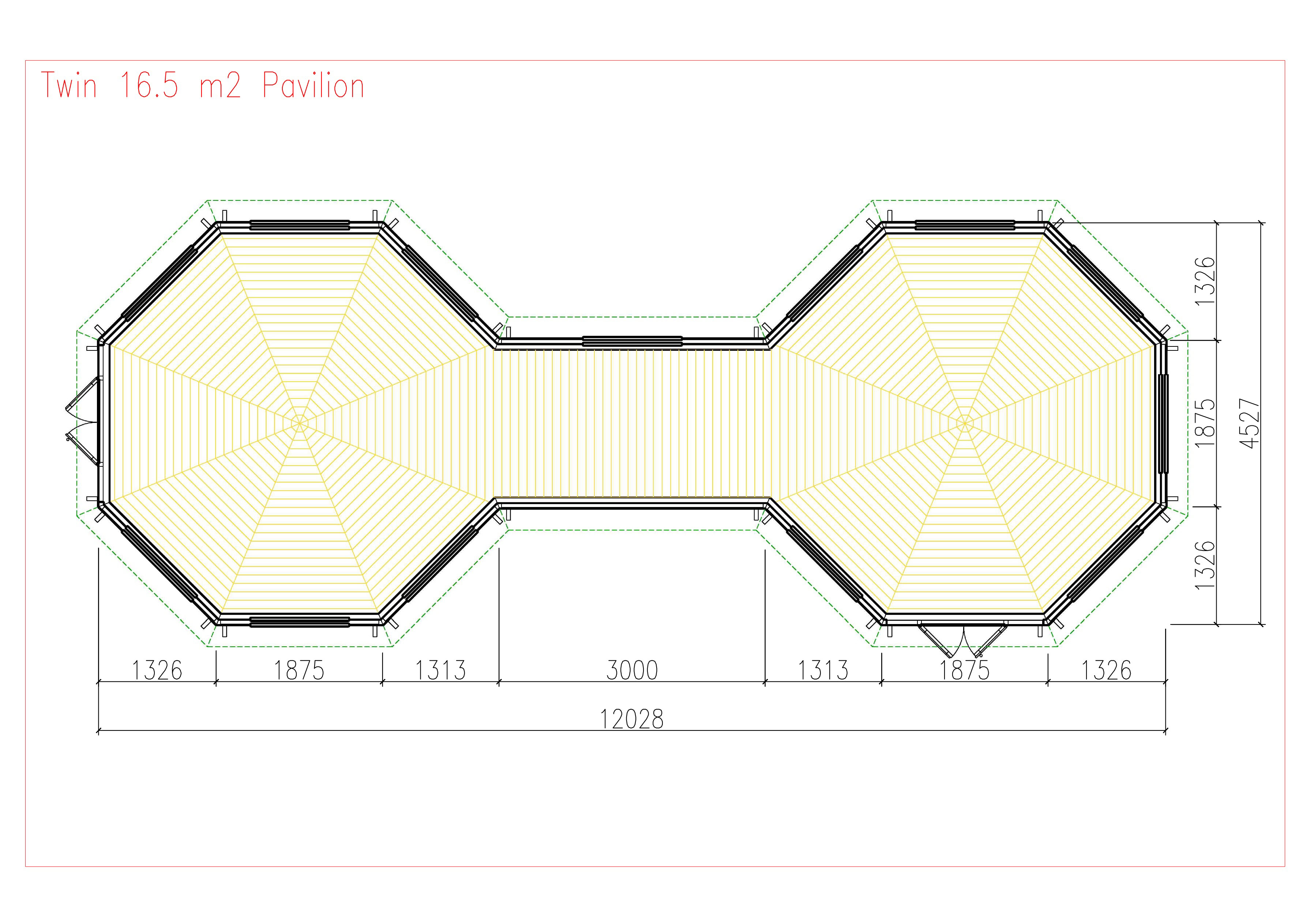 Střecha: 18 mm borové obložení zvenčí a 14 mm vnitřní borové obložení se 100 mm izolací z kamenné vlny mezi, pokryto tmavě hnědou bitumenovou krytinou membrány