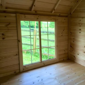 Střecha: 18 mm borové obložení zvenčí a 14 mm vnitřní borové obložení se 100 mm izolací z kamenné vlny mezi, pokryto tmavě hnědou bitumenovou krytinou membrány