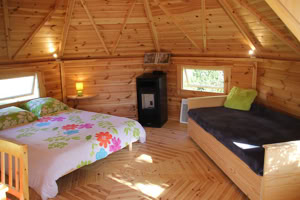 Střecha: 18 mm borové obložení zvenčí a 14 mm vnitřní borové obložení se 100 mm izolací z kamenné vlny mezi, pokryto tmavě hnědou bitumenovou krytinou membrány