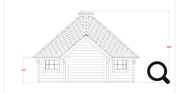 Střecha: 18 mm borové obložení zvenčí a 14 mm vnitřní borové obložení se 100 mm izolací z kamenné vlny mezi, pokryto tmavě hnědou bitumenovou krytinou membrány