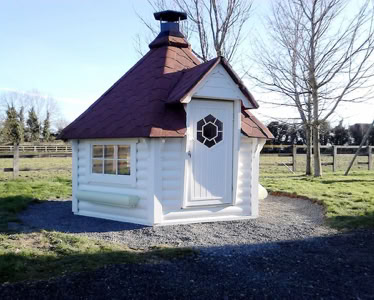 Střecha: 18 mm borové obložení zvenčí a 14 mm vnitřní borové obložení se 100 mm izolací z kamenné vlny mezi, pokryto tmavě hnědou bitumenovou krytinou membrány