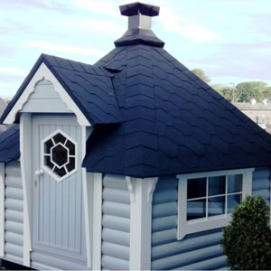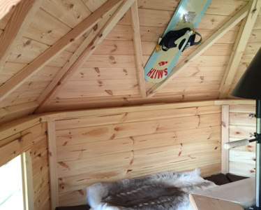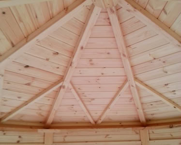 Střecha: 18 mm borové obložení zvenčí a 14 mm vnitřní borové obložení se 100 mm izolací z kamenné vlny mezi, pokryto tmavě hnědou bitumenovou krytinou membrány