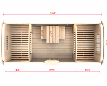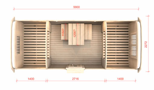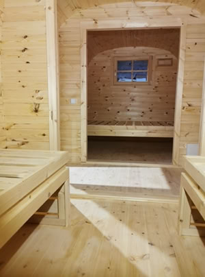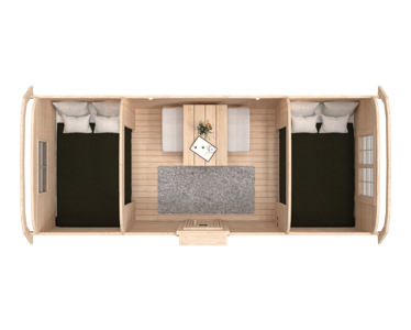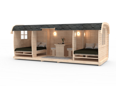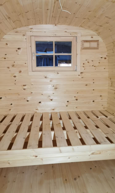 Střecha: 18 mm borové obložení zvenčí a 14 mm vnitřní borové obložení se 100 mm izolací z kamenné vlny mezi, pokryto tmavě hnědou bitumenovou krytinou membrány