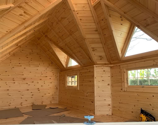 Střecha: 18 mm borové obložení zvenčí a 14 mm vnitřní borové obložení se 100 mm izolací z kamenné vlny mezi, pokryto tmavě hnědou bitumenovou krytinou membrány