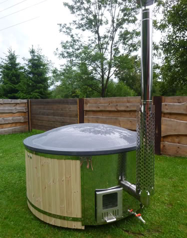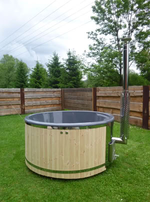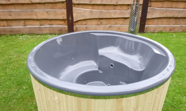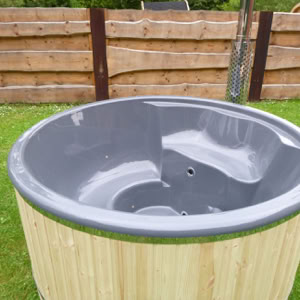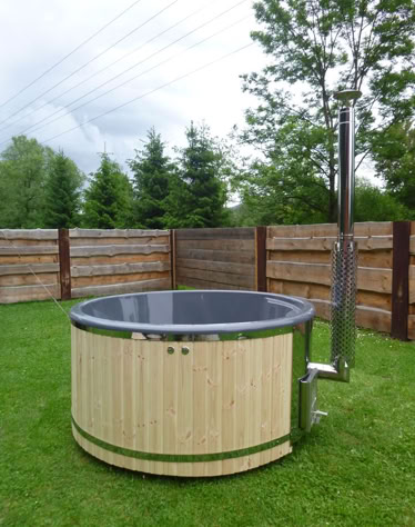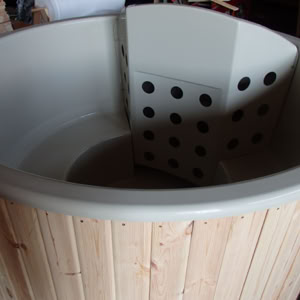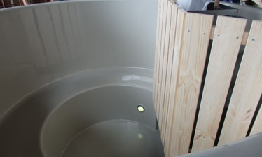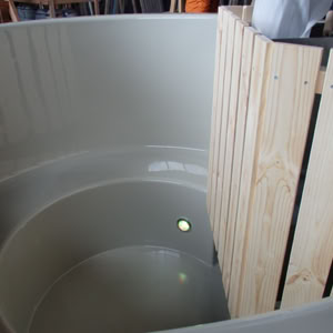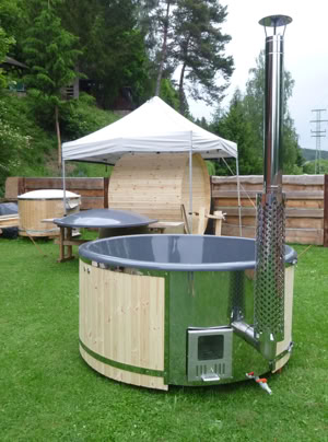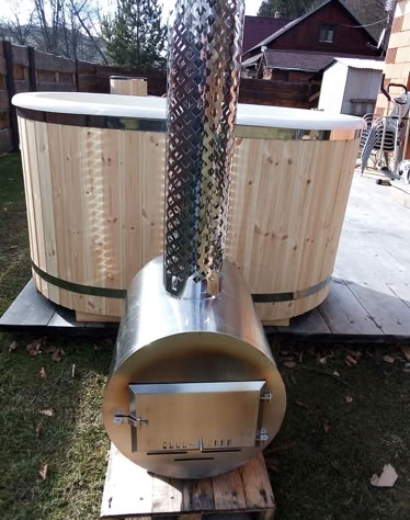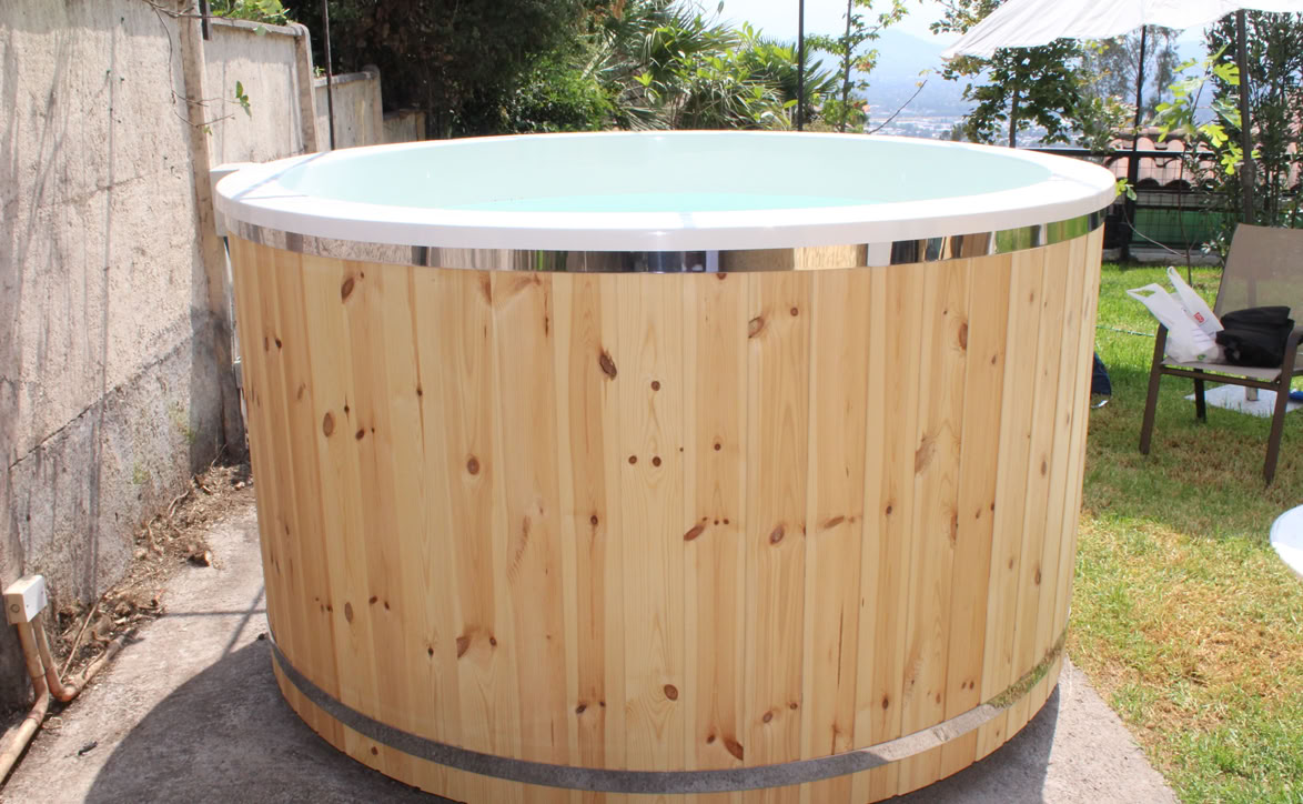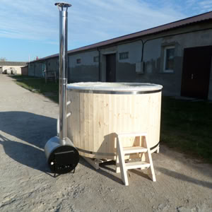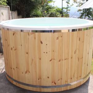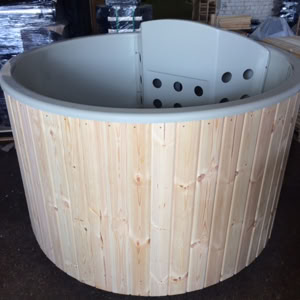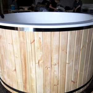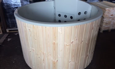 Koupací sud ze skleněných vláken s povrchovou úpravou z 14 mm borovicového dřeva