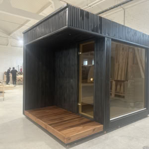 Střecha: OSB zvenku: 10 mm Termo-dřevěné obložení zevnitř: 19 mm Konstrukční borovicová kostra: 45 x 95 mm Izolace z kamenné vlny: 100 mm Tloušťka izolované stěny: 124 mm Potaženo černými bitumenovými střešními membránami