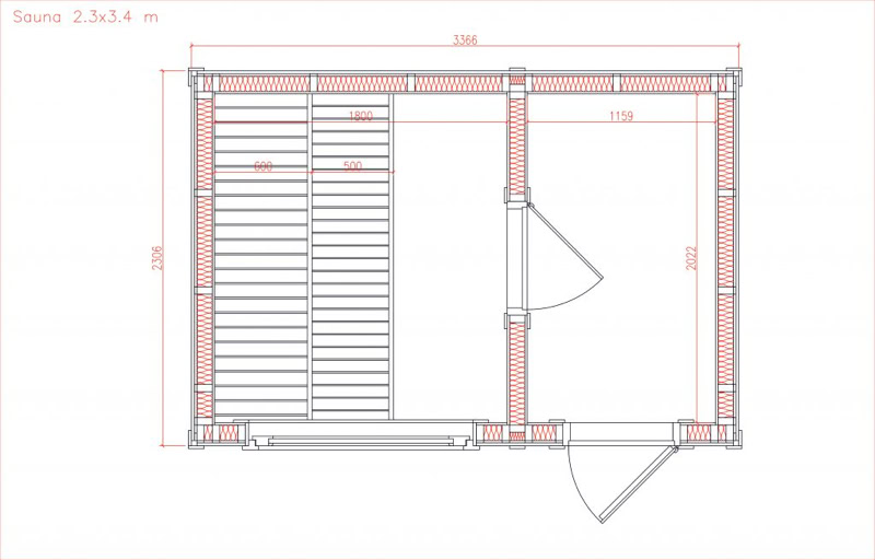 Stěna: Obložení borovice zvenčí: 18 mm; Borovicové obložení zevnitř: 14 mm;