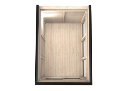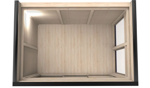 Střecha: 18 mm borové obložení zvenčí a 14 mm vnitřní borové obložení se 100 mm izolací z kamenné vlny mezi, pokryto tmavě hnědou bitumenovou krytinou membrány