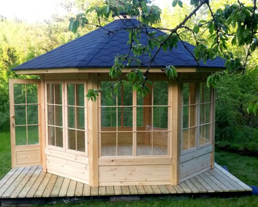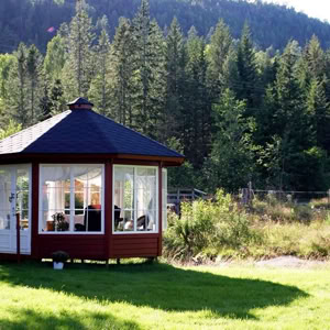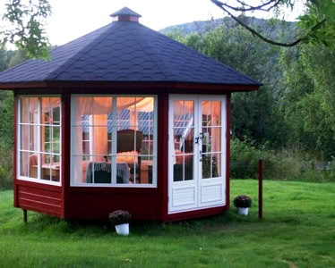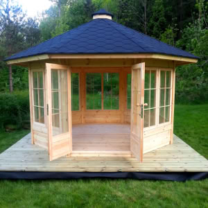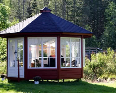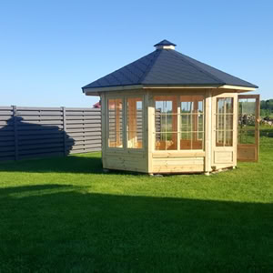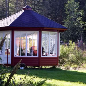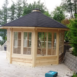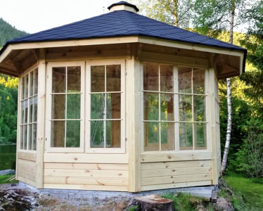 Střecha: 18 mm borové obložení zvenčí a 14 mm vnitřní borové obložení se 100 mm izolací z kamenné vlny mezi, pokryto tmavě hnědou bitumenovou krytinou membrány