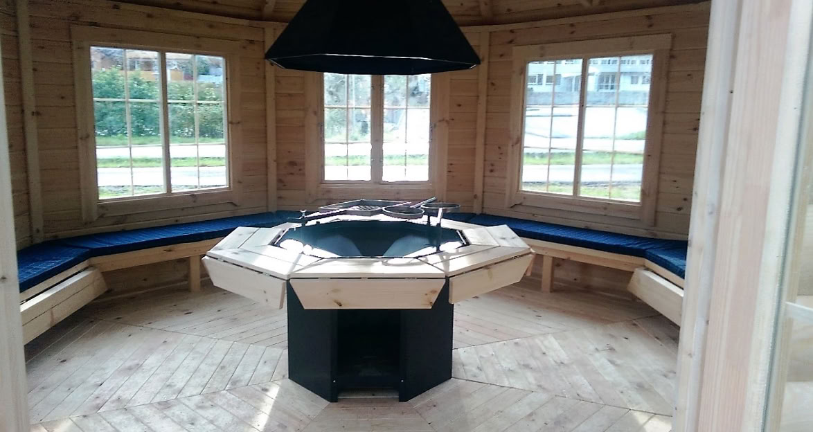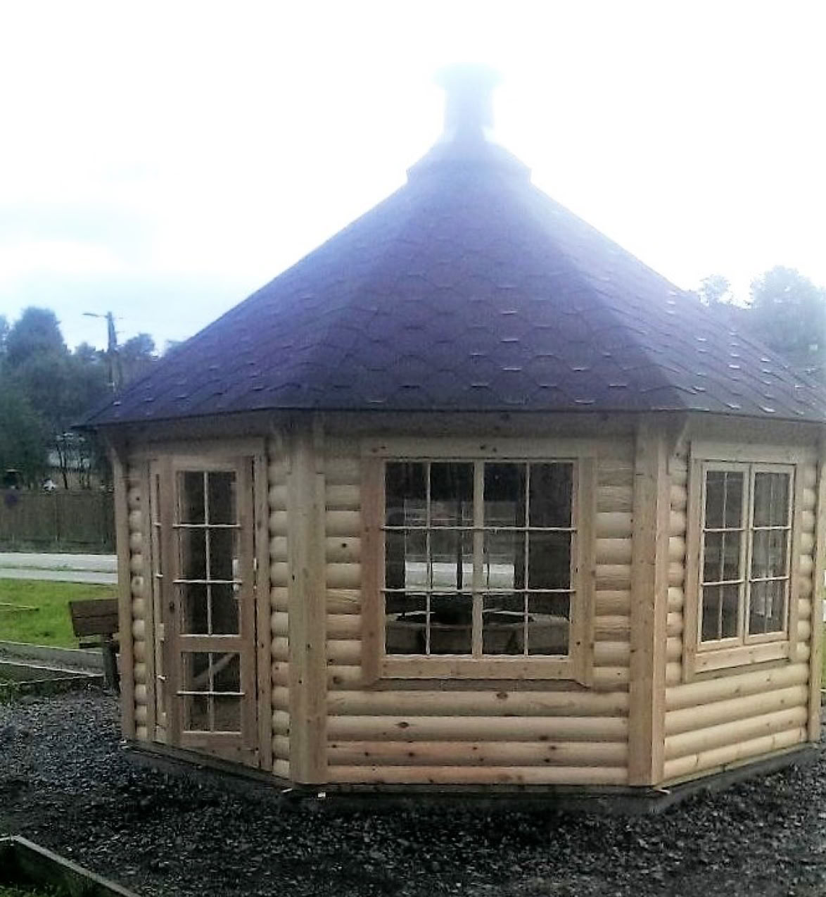 Střecha: 18 mm borové obložení zvenčí a 14 mm vnitřní borové obložení se 100 mm izolací z kamenné vlny mezi, pokryto tmavě hnědou bitumenovou krytinou membrány