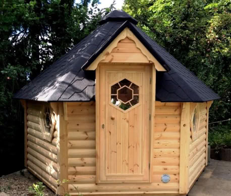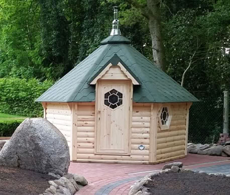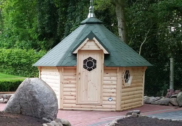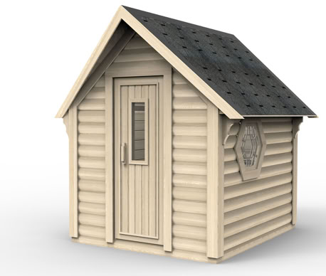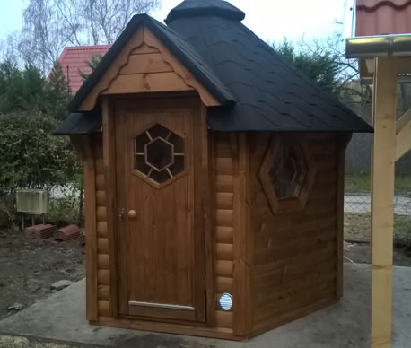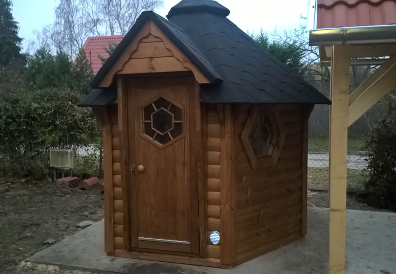 panely pokryté bitumenovým šindelem, dvojitá šestihranná okna, dřevěné dveře s dvojitým zaskleným šestihranným oknem, dřevěná klika a zámek, vnitřní lavice, opěradla, bezpečnostní plot, teplo -odolné desky pro topidlo/sporák a vnitřní tvrzené tónované skleněné dveře v saunách s šatnou.