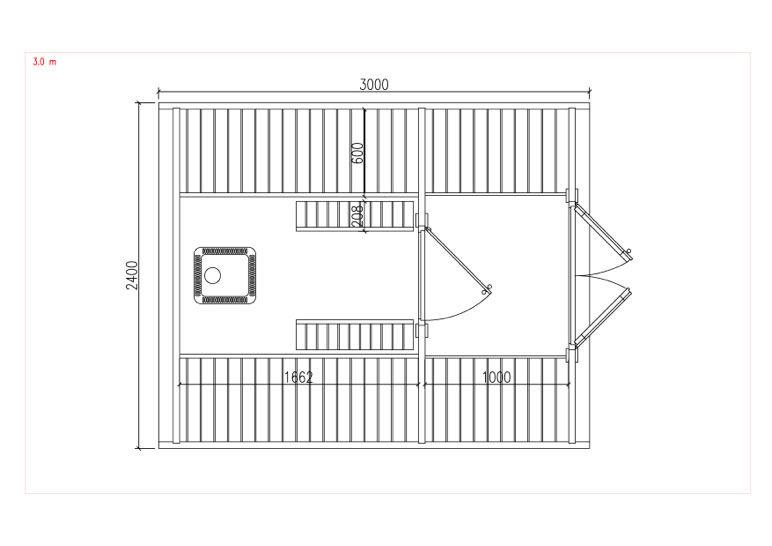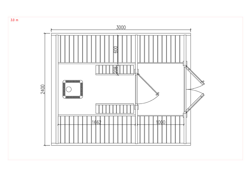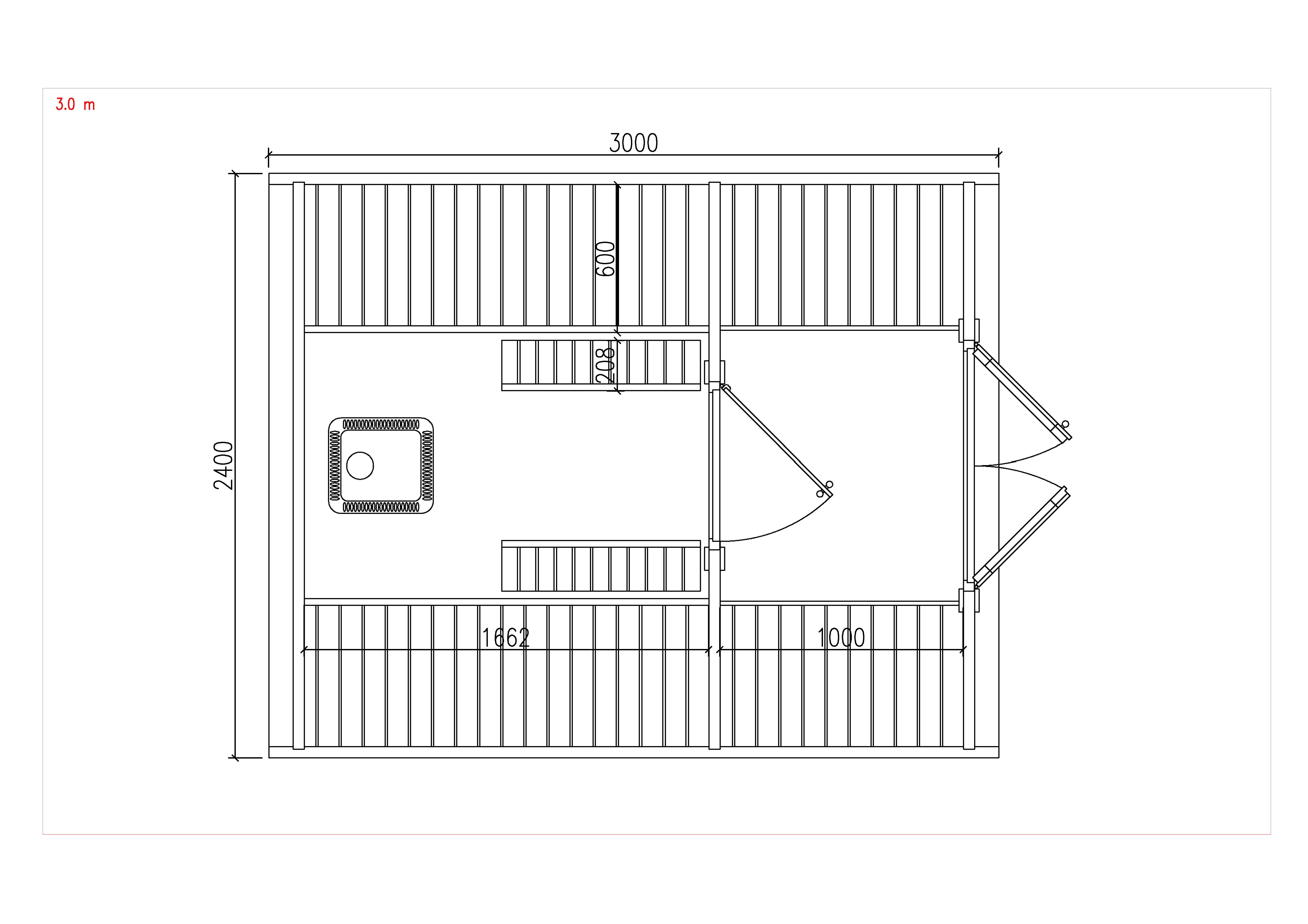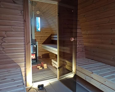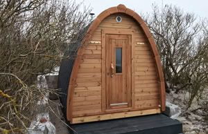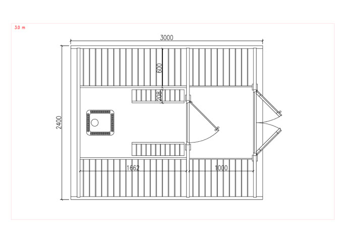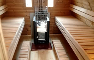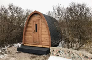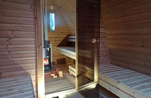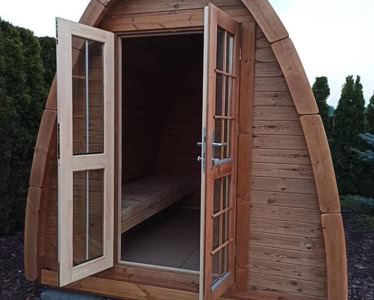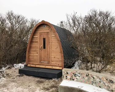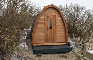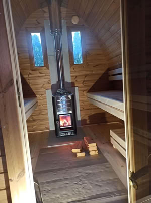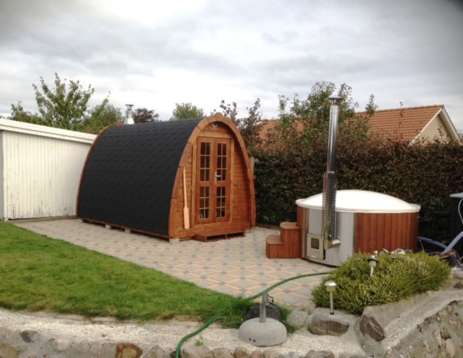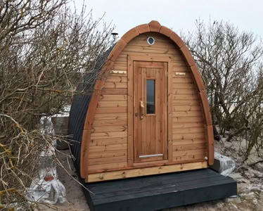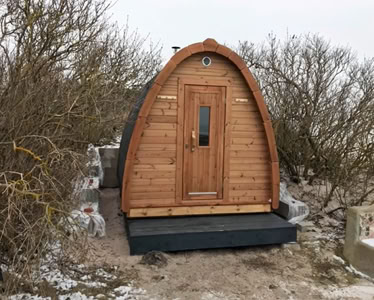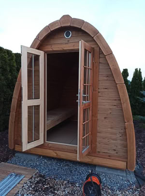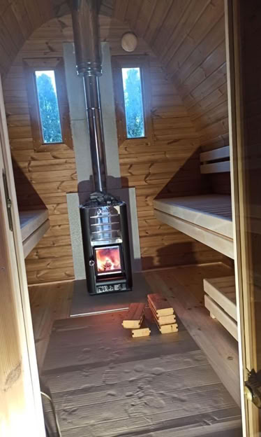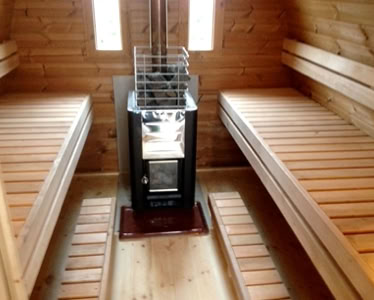 Střecha: 18 mm borové obložení zvenčí a 14 mm vnitřní borové obložení se 100 mm izolací z kamenné vlny mezi, pokryto tmavě hnědou bitumenovou krytinou membrány