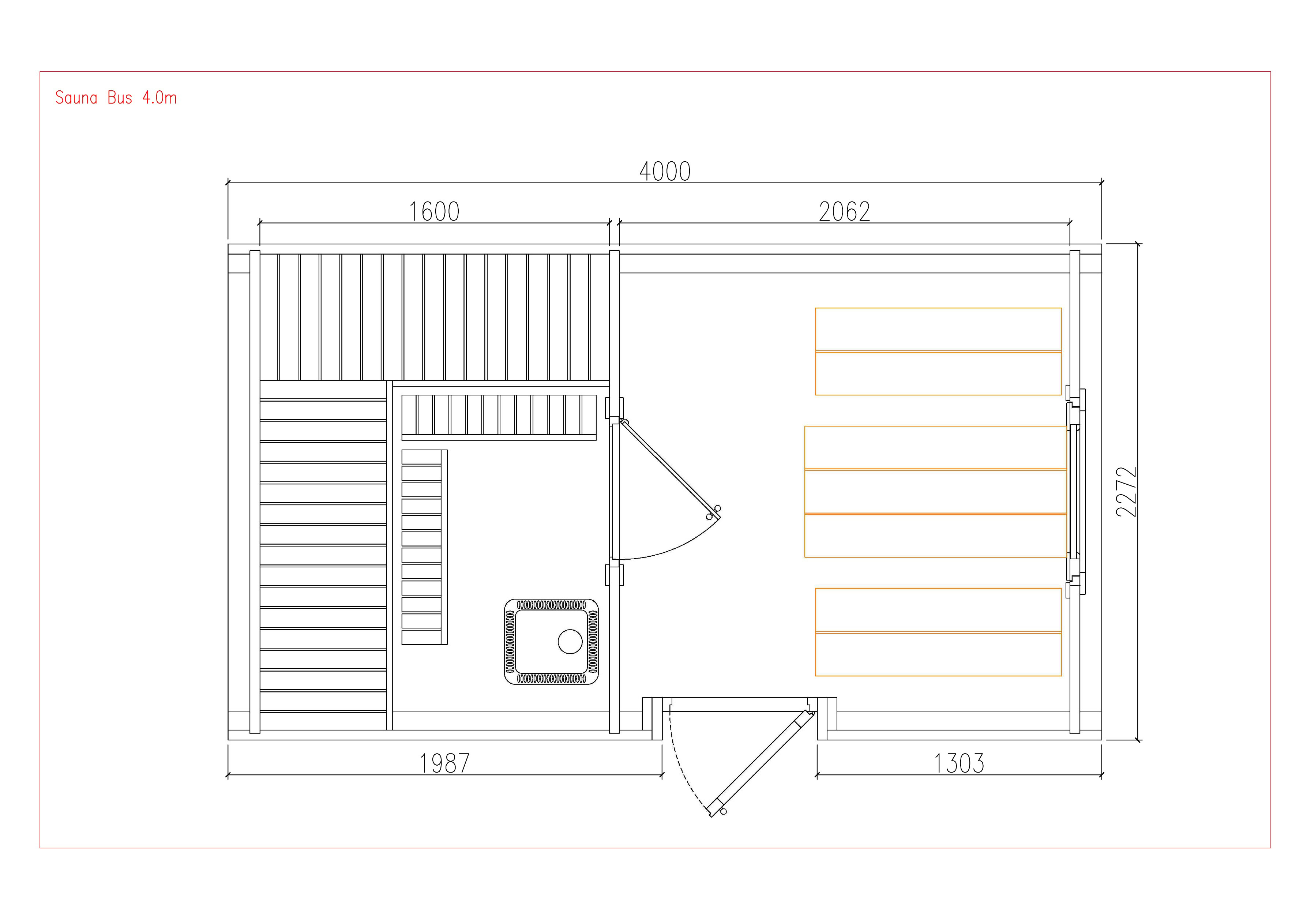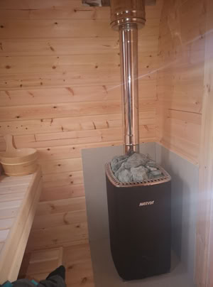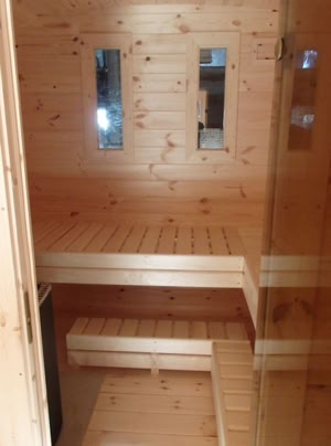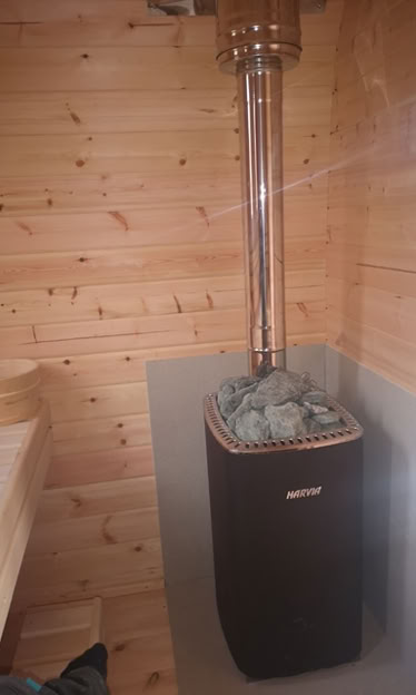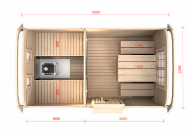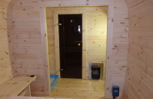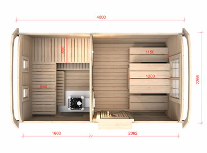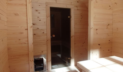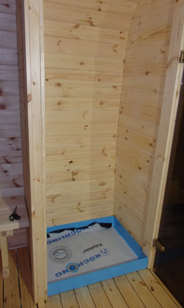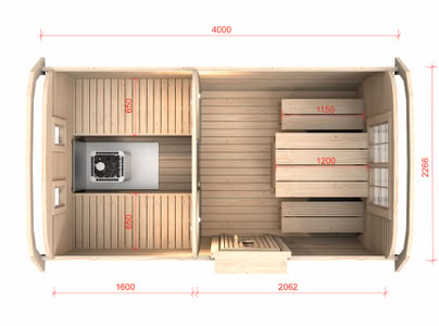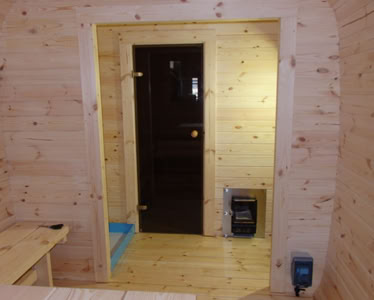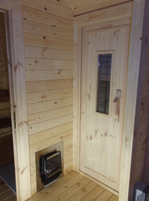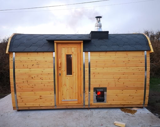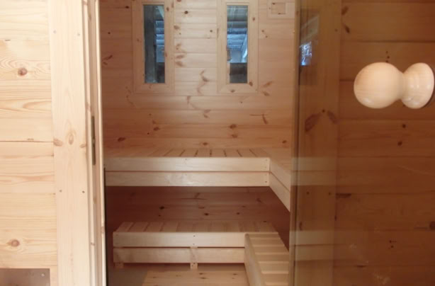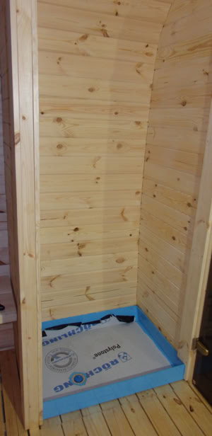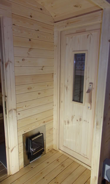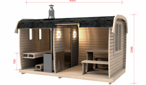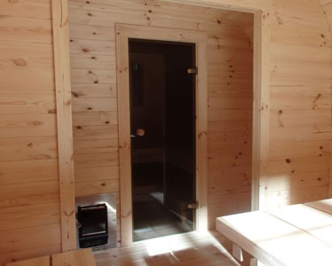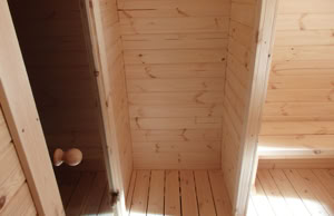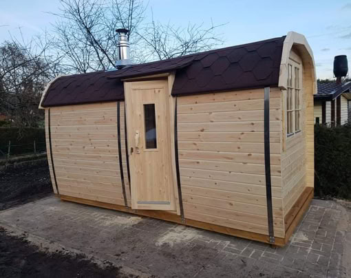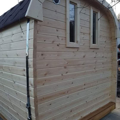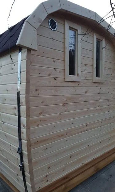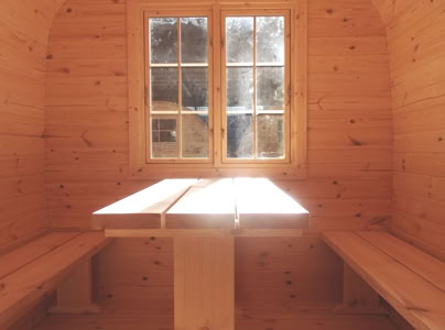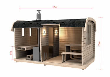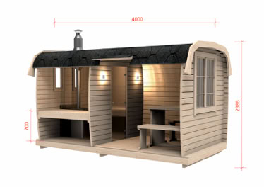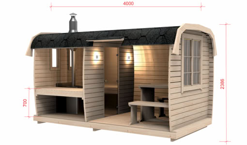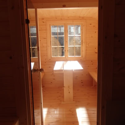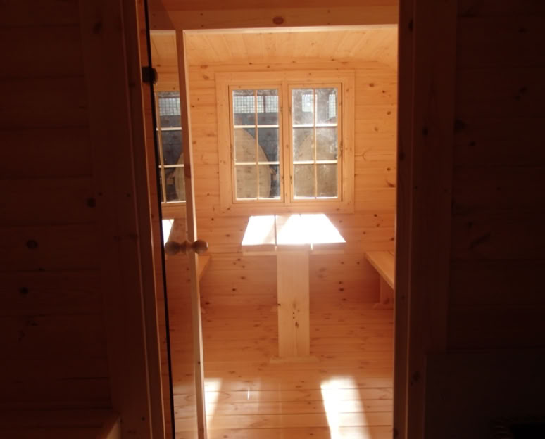Střecha: 18 mm borové obložení zvenčí a 14 mm vnitřní borové obložení se 100 mm izolací z kamenné vlny mezi, pokryto tmavě hnědou bitumenovou krytinou membrány