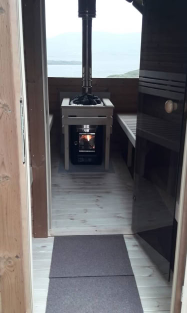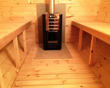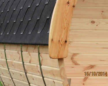 Střecha: 18 mm borové obložení zvenčí a 14 mm vnitřní borové obložení se 100 mm izolací z kamenné vlny mezi, pokryto tmavě hnědou bitumenovou krytinou membrány