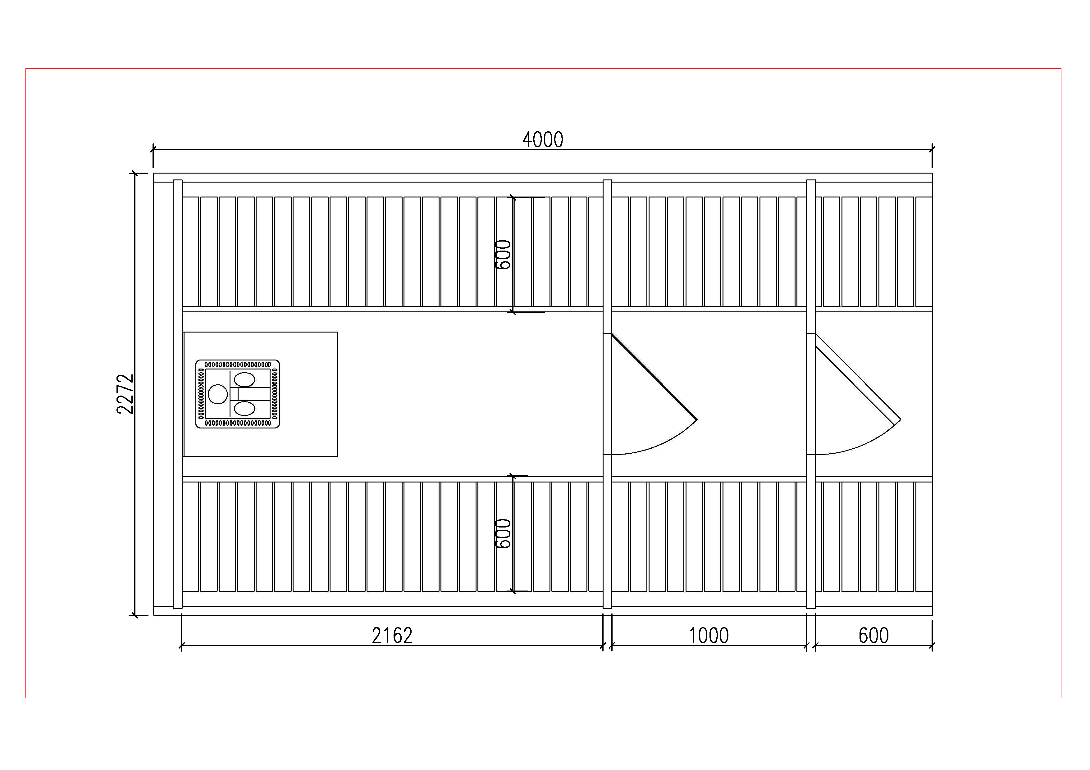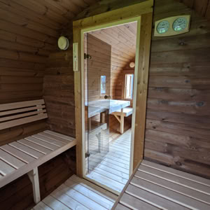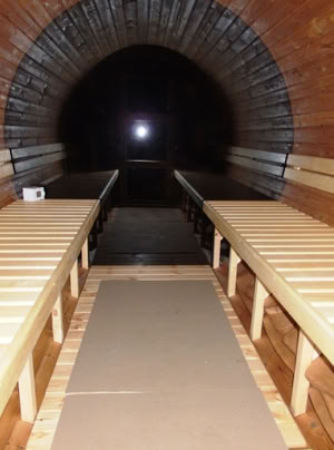 Střecha: 18 mm borové obložení zvenčí a 14 mm vnitřní borové obložení se 100 mm izolací z kamenné vlny mezi, pokryto tmavě hnědou bitumenovou krytinou membrány