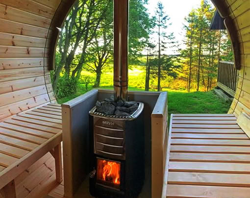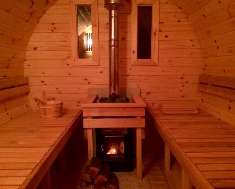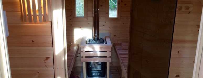 Střecha: 18 mm borové obložení zvenčí a 14 mm vnitřní borové obložení se 100 mm izolací z kamenné vlny mezi, pokryto tmavě hnědou bitumenovou krytinou membrány