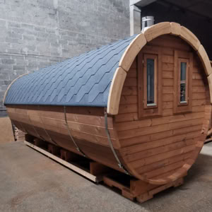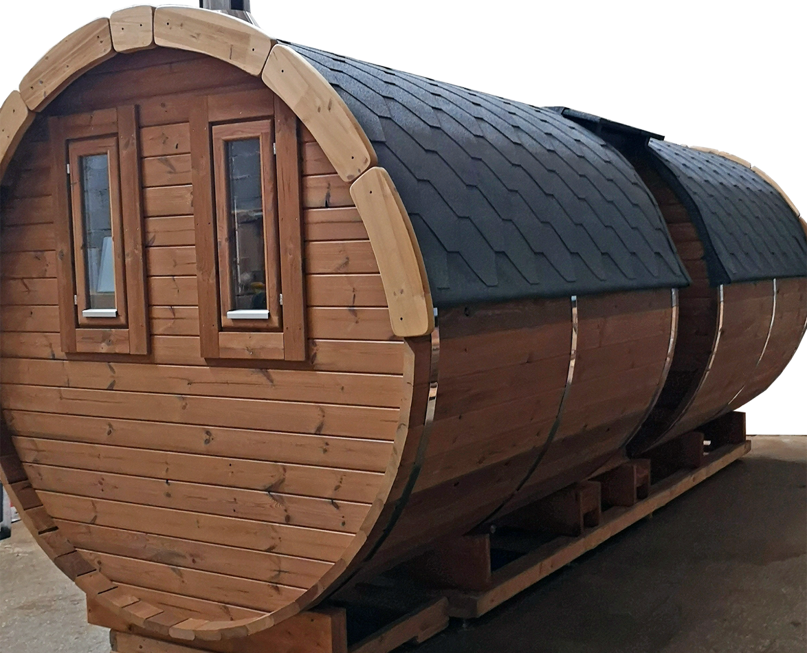 Střecha: 18 mm borové obložení zvenčí a 14 mm vnitřní borové obložení se 100 mm izolací z kamenné vlny mezi, pokryto tmavě hnědou bitumenovou krytinou membrány